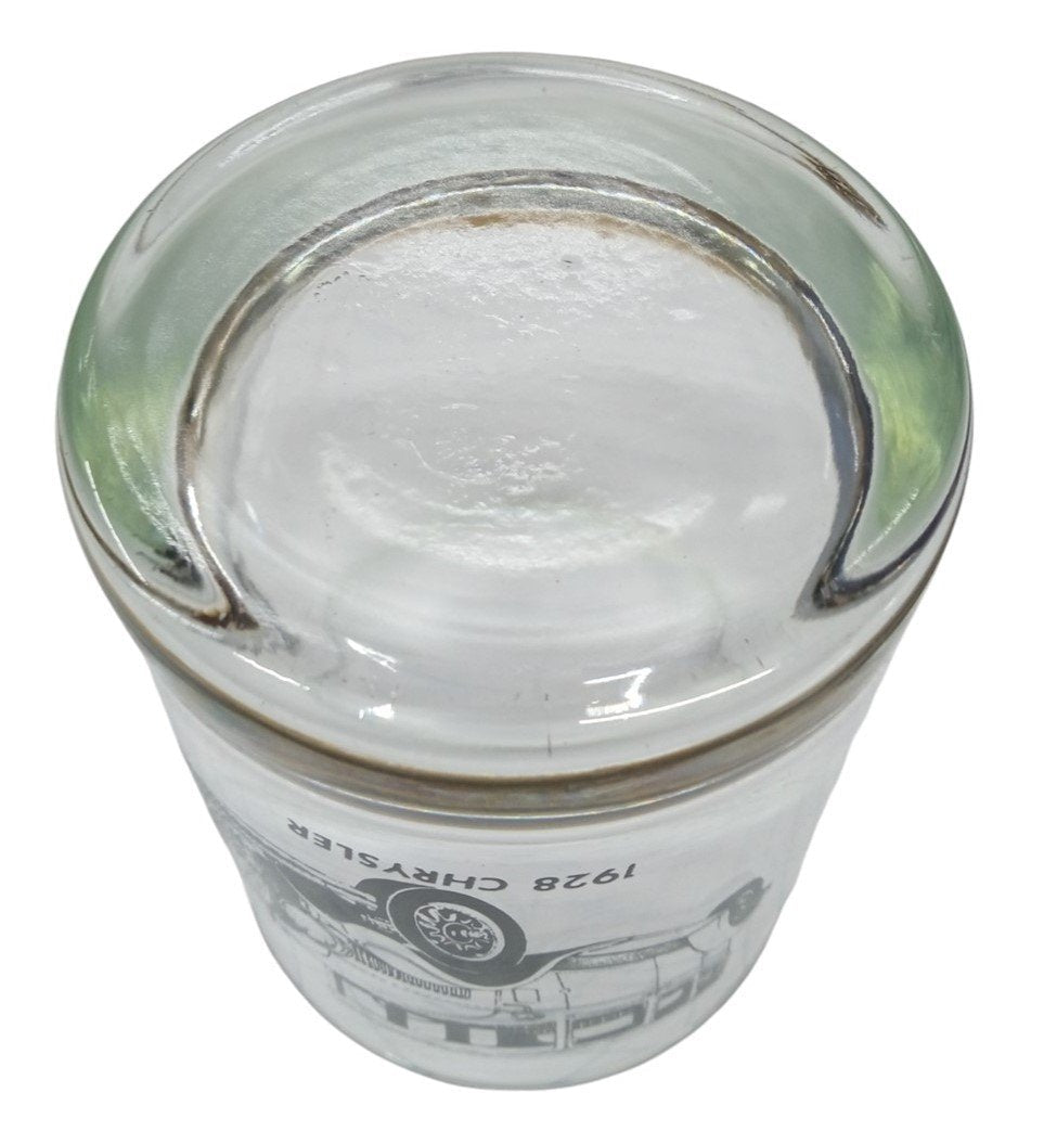 This is a vintage whisky glass likely made by Chrysler around the 1960s. It features an illustration of a 1928 Chrysler automobile. Some very minor marks and scratches are visible but otherwise this is in great condition for its age. This is a great item for any aspiring collector and is a perfect fit in any glass collection! Makes a great addition to any bar! This measures about 3" by 3" by 4".