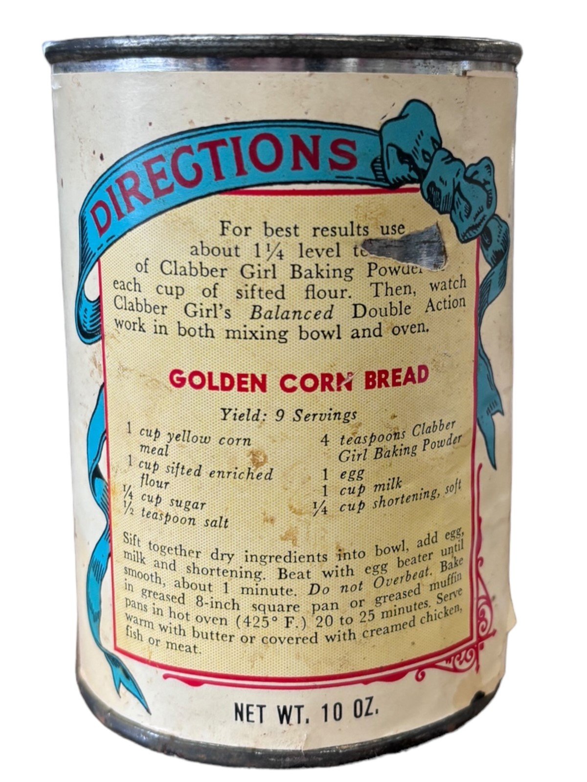 This is the Clabber Girl double acting baking powder. The can has some vintage wear and the can has a dent on one side. However it appears that the can has not been opened. It measures 4in x 3in x 3in.Take a look at the pictures for the best description. A photo is as good as a thousand words and is the best description of cosmetic condition. Use your ZOOM TOOL to best see this item! Please look closely at the photos for condition answers.