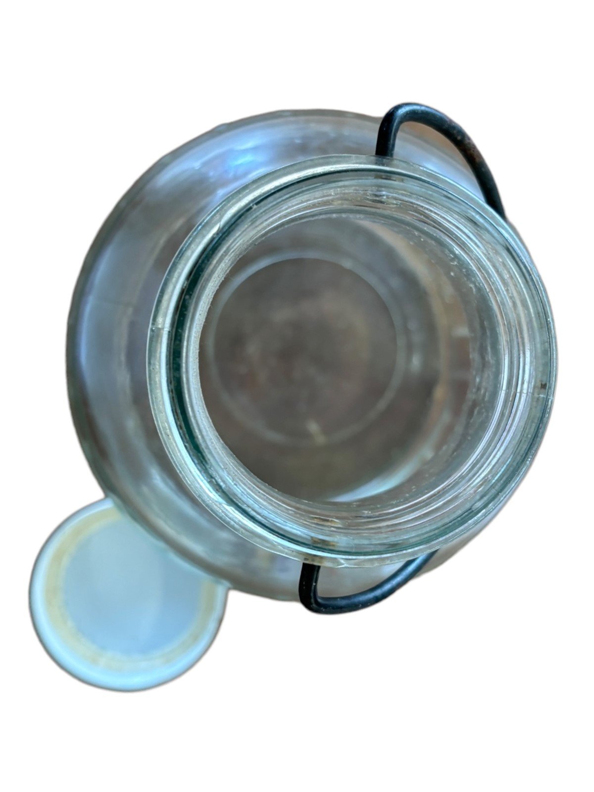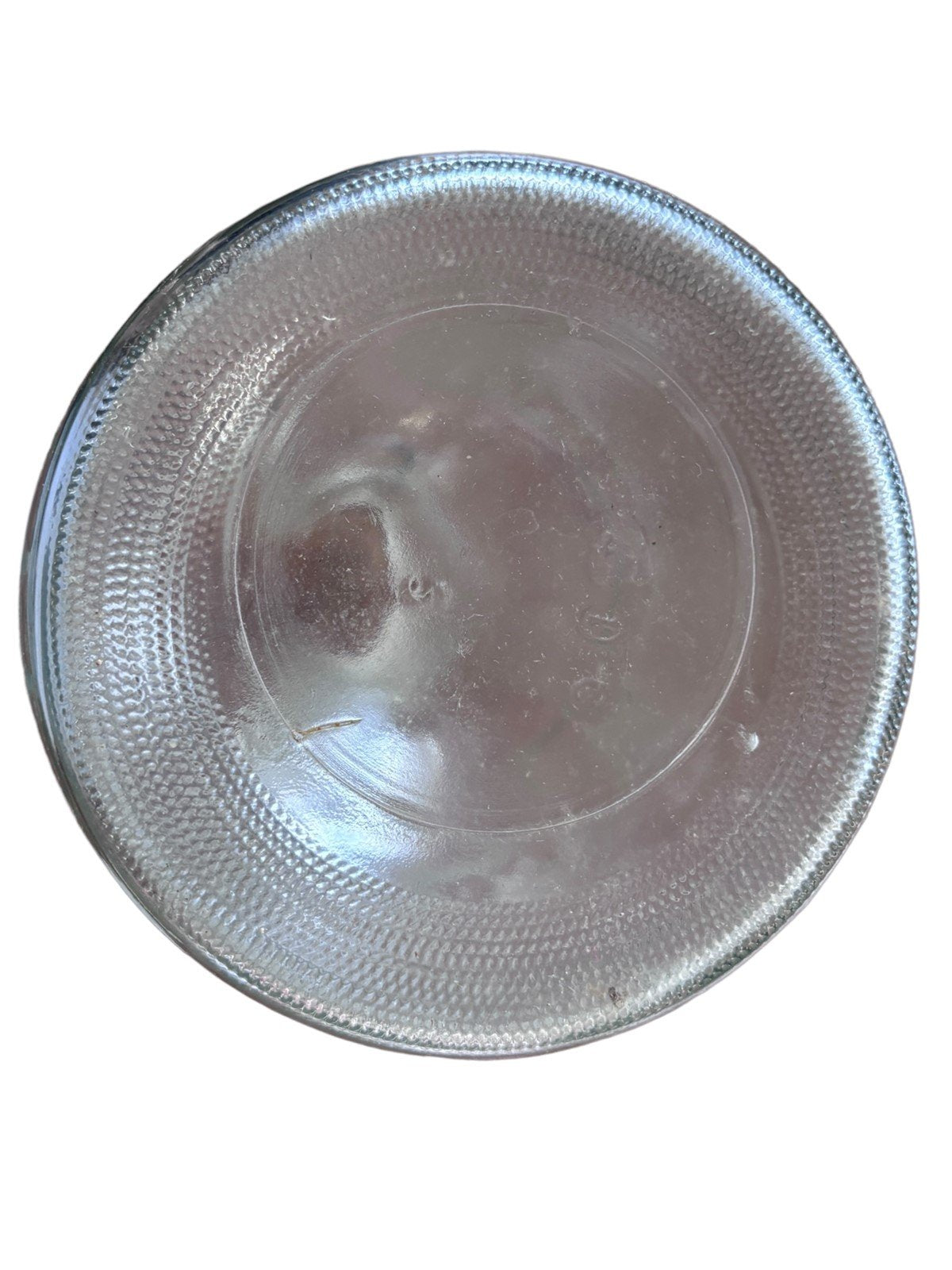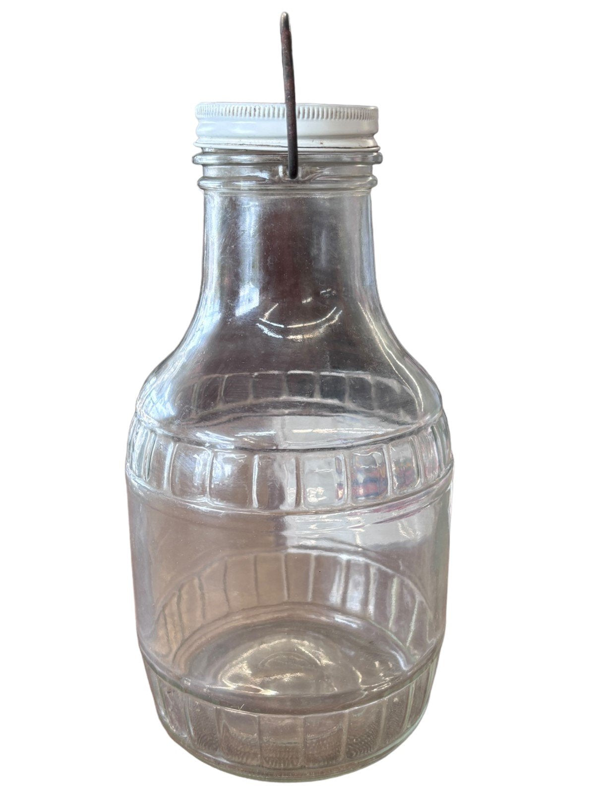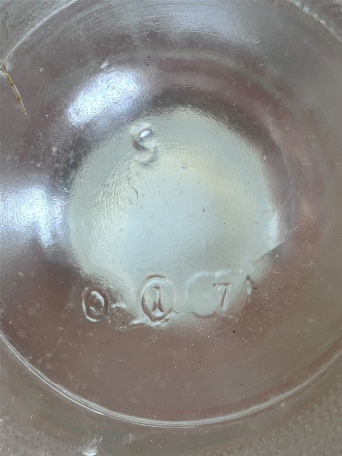 This is a clear half quart jug with a metal handle. We believe it is a Motts jug that held juice. It is in great condition and has 017 engraved on the bottom. It measures 3in x 5in x 10 1/2in.Take a look at the pictures for the best description. A photo is as good as a thousand words and is the best description of cosmetic condition. Use your ZOOM TOOL to best see this item! Please look closely at the photos for condition answers.