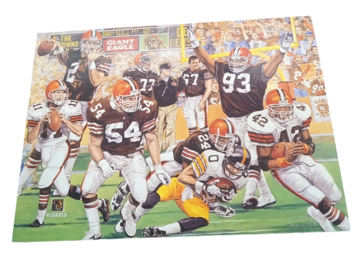 This is a set of Cleveland Browns commemorative coins issued in 1999. The plastic cover has some minor tears visible but the coins themselves are in great condition for their age. This is a great set for any aspiring collector and is a perfect fit in any football or coin collection! The whole set measures about 8" by 6" by 0.5", and each coin measures about 1" by 1" by 0.5".
