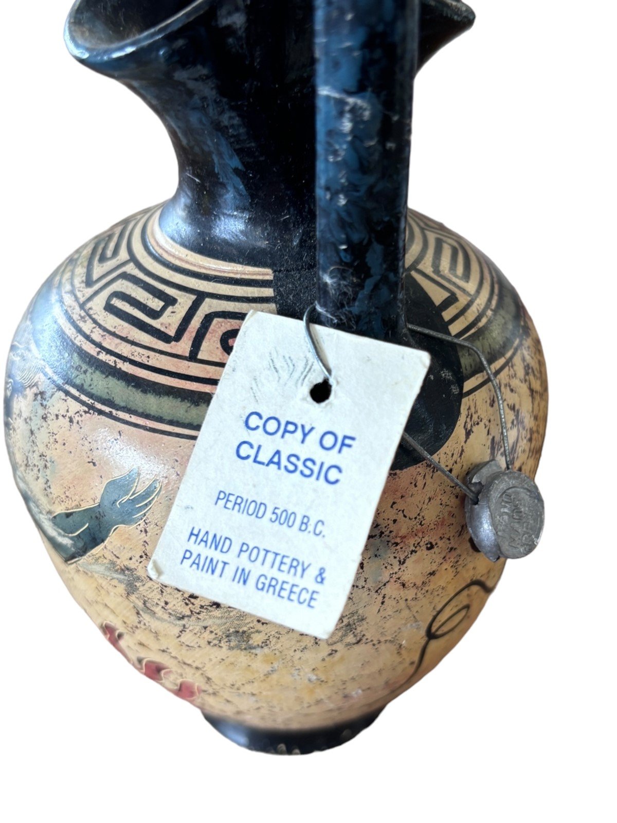 This is a super cool copy of a classic mini handled Greek Vase. It's a copy of a period 500 B.C. vase. It measures 6in tall and 3 1/2in wide. It's in amazing condition; it's a must have!Take a look at the pictures for the best description. A photo is as good as a thousand words and is the best description of cosmetic condition. Use your ZOOM TOOL to best see this item! Please look closely at the photos for condition answers.