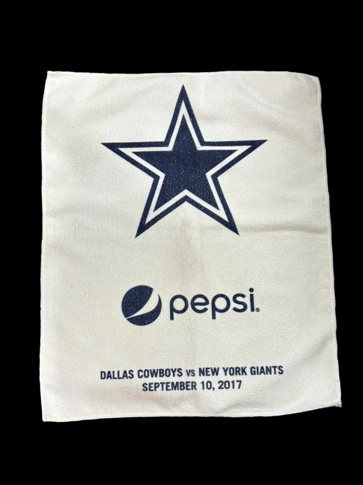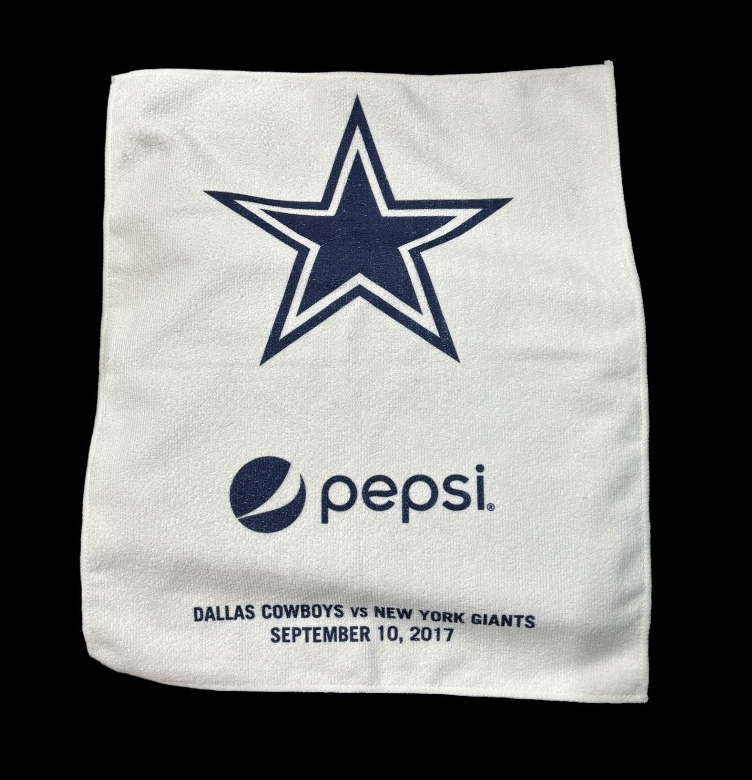 Pair of Dallas Cowboys Pepsi Towels from the Cowboys vs NY Giants on September 10, 2017. These are official NFL towels with the sticker on the back. Both are in perfect condition. They each measure 17" x 14" and feature the Cowboys logo and Pepsi's logo.Take a look at the pictures for the best description. A photo is as good as a thousand words and is the best description of cosmetic condition. Use your ZOOM TOOL to best see this item! Please look closely at the photos for condition answers.