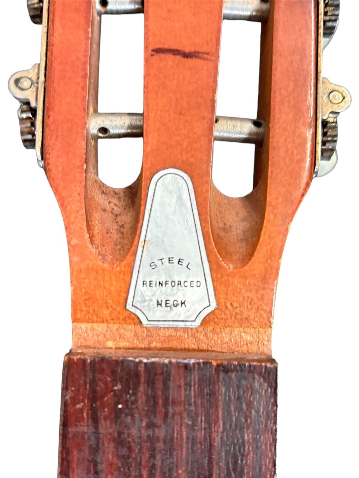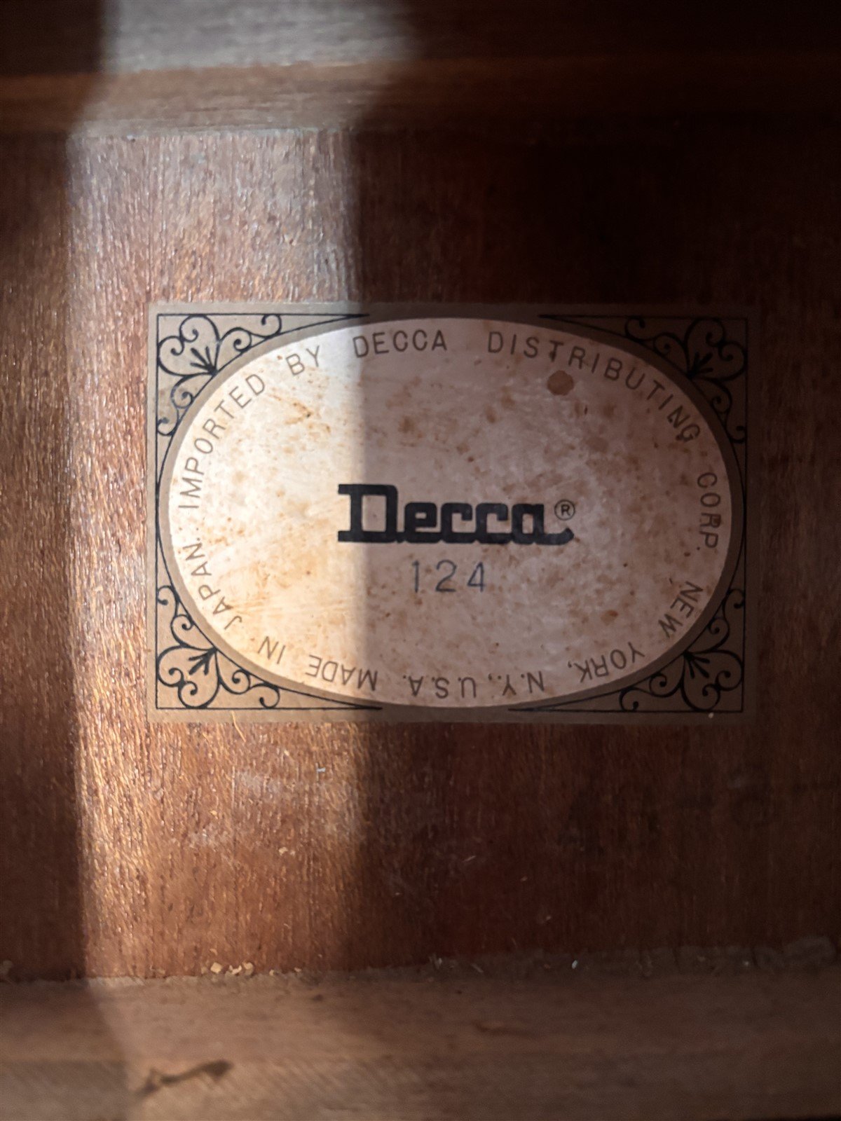 This is a Decca acoustic wooden guitar. Its number is 124. It has a few marks and it doesn't have strings. Other than that it's in good condition. It's 36in x 13in x 3in.Take a look at the pictures for the best description. A photo is as good as a thousand words and is the best description of cosmetic condition. Use your ZOOM TOOL to best see this item! Please look closely at the photos for condition answers.