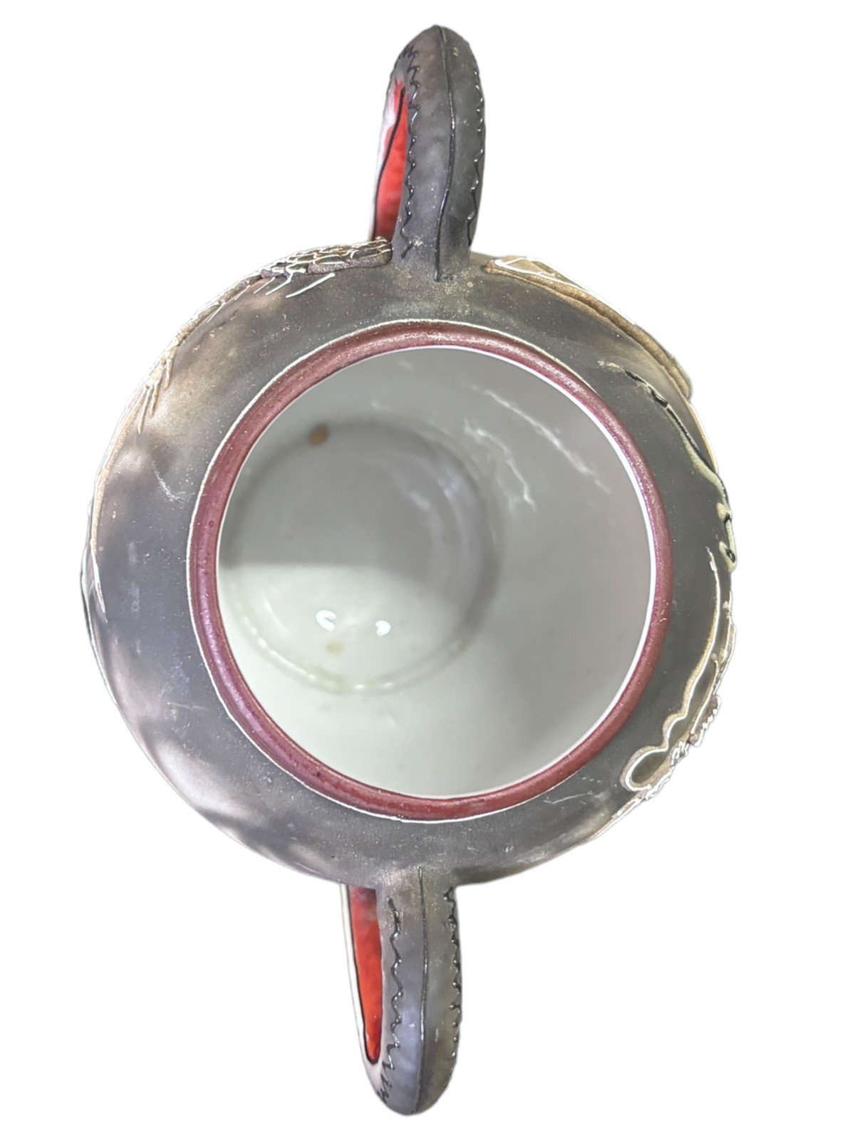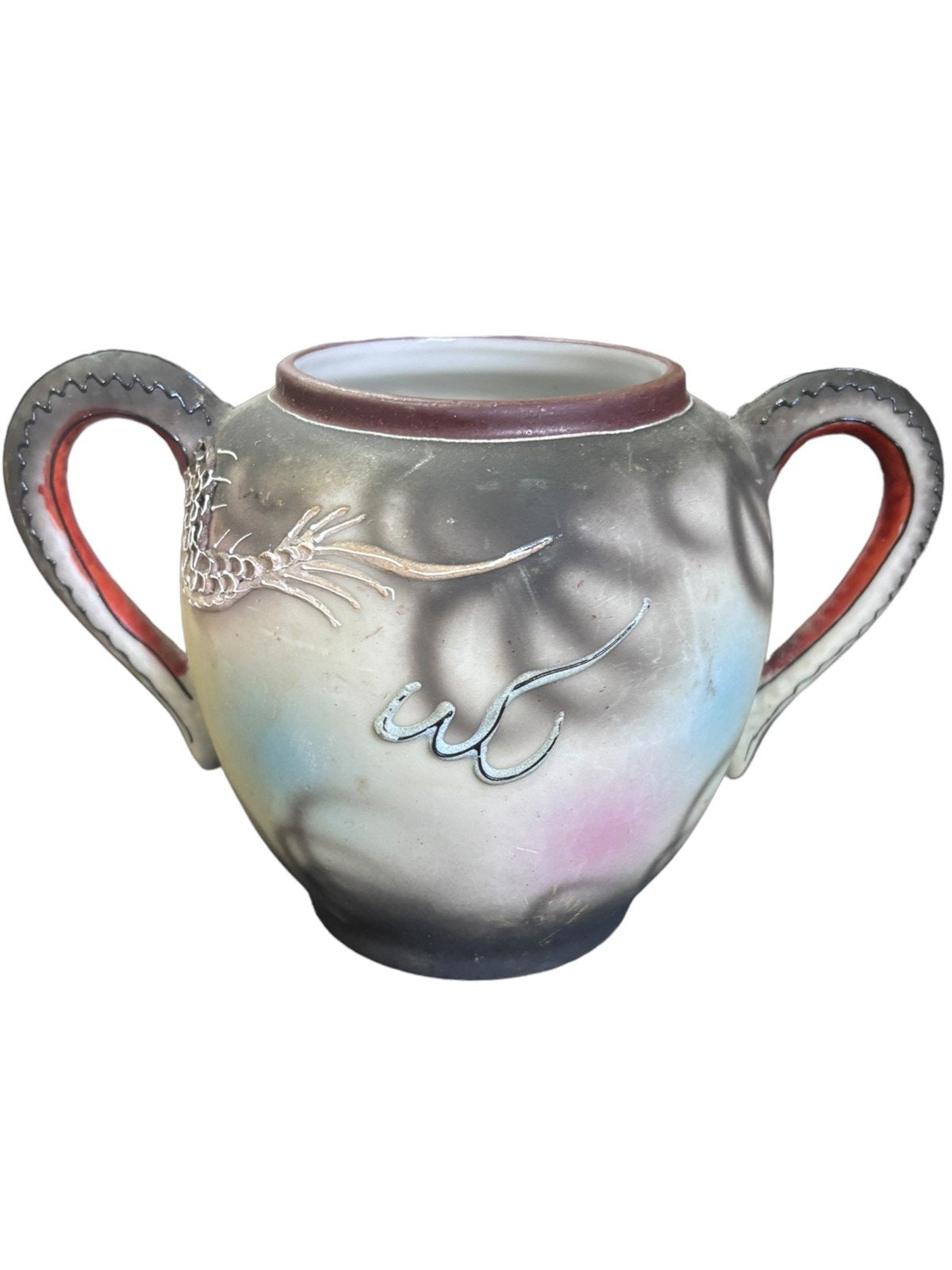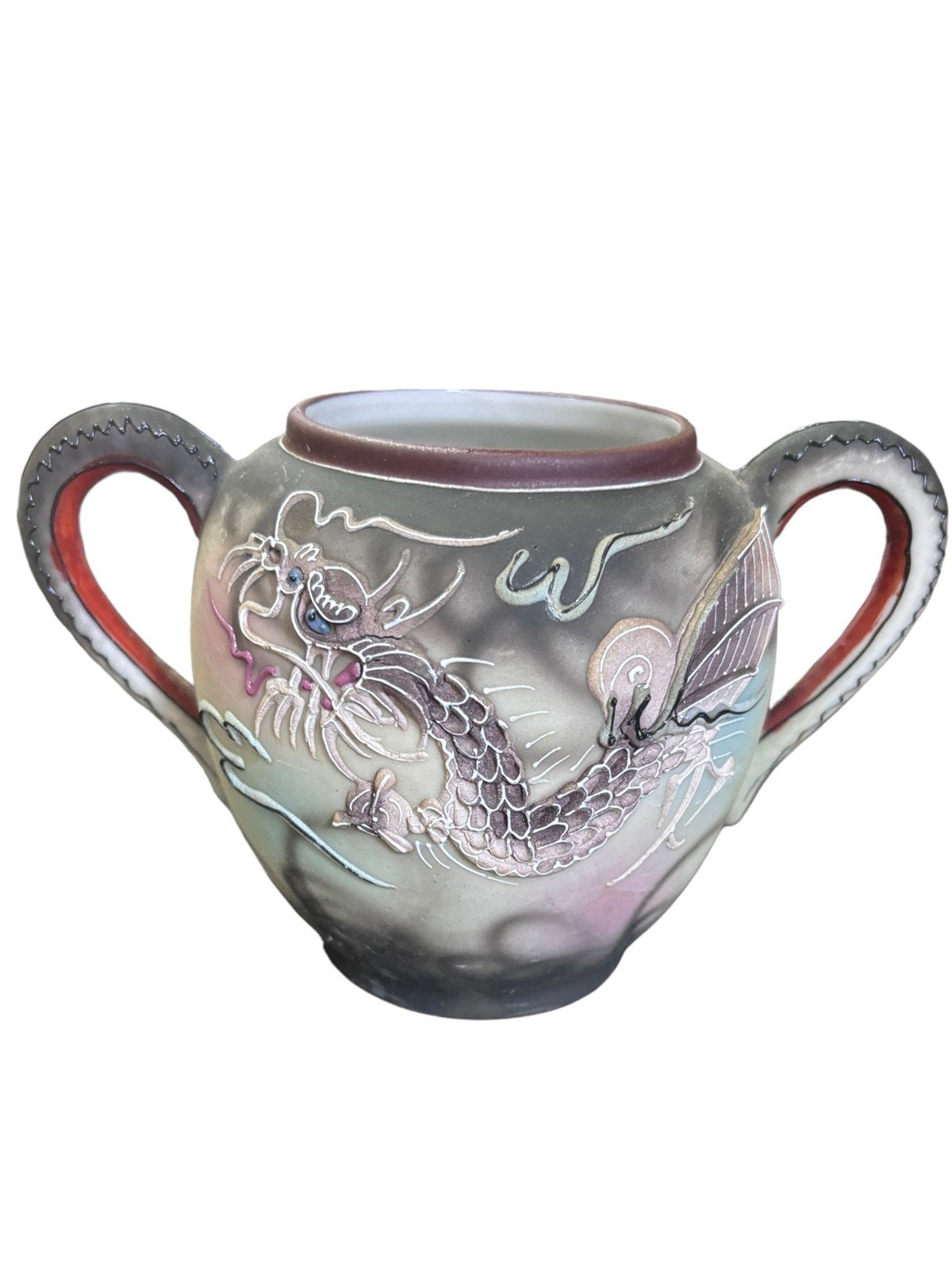 This is a super cool dragonware Japanese dual handled vase. It has no lid. It measures 4in x 6 1/2in x 4 1/2in. It was stamped made in japan.Take a look at the pictures for the best description. A photo is as good as a thousand words and is the best description of cosmetic condition. Use your ZOOM TOOL to best see this item! Please look closely at the photos for condition answers.