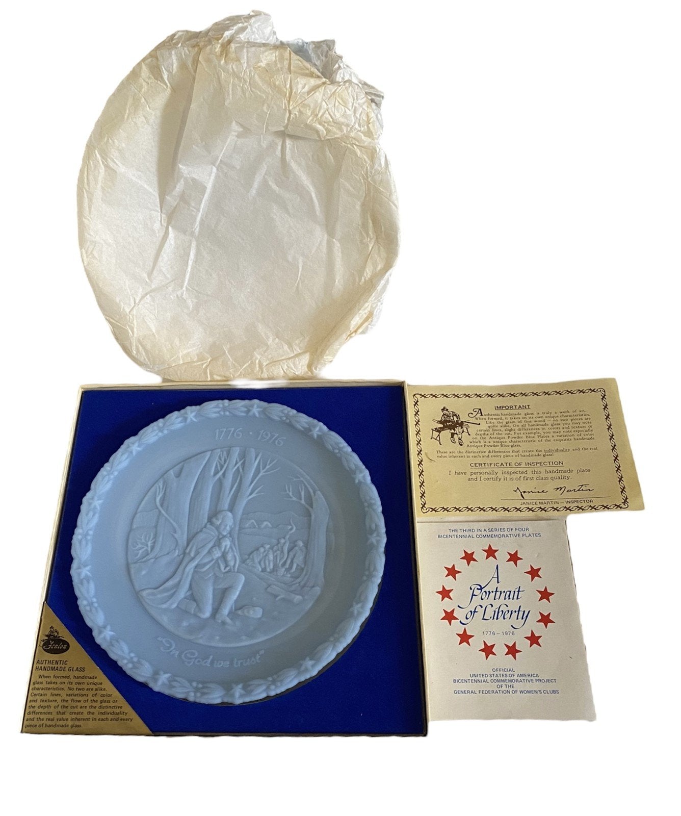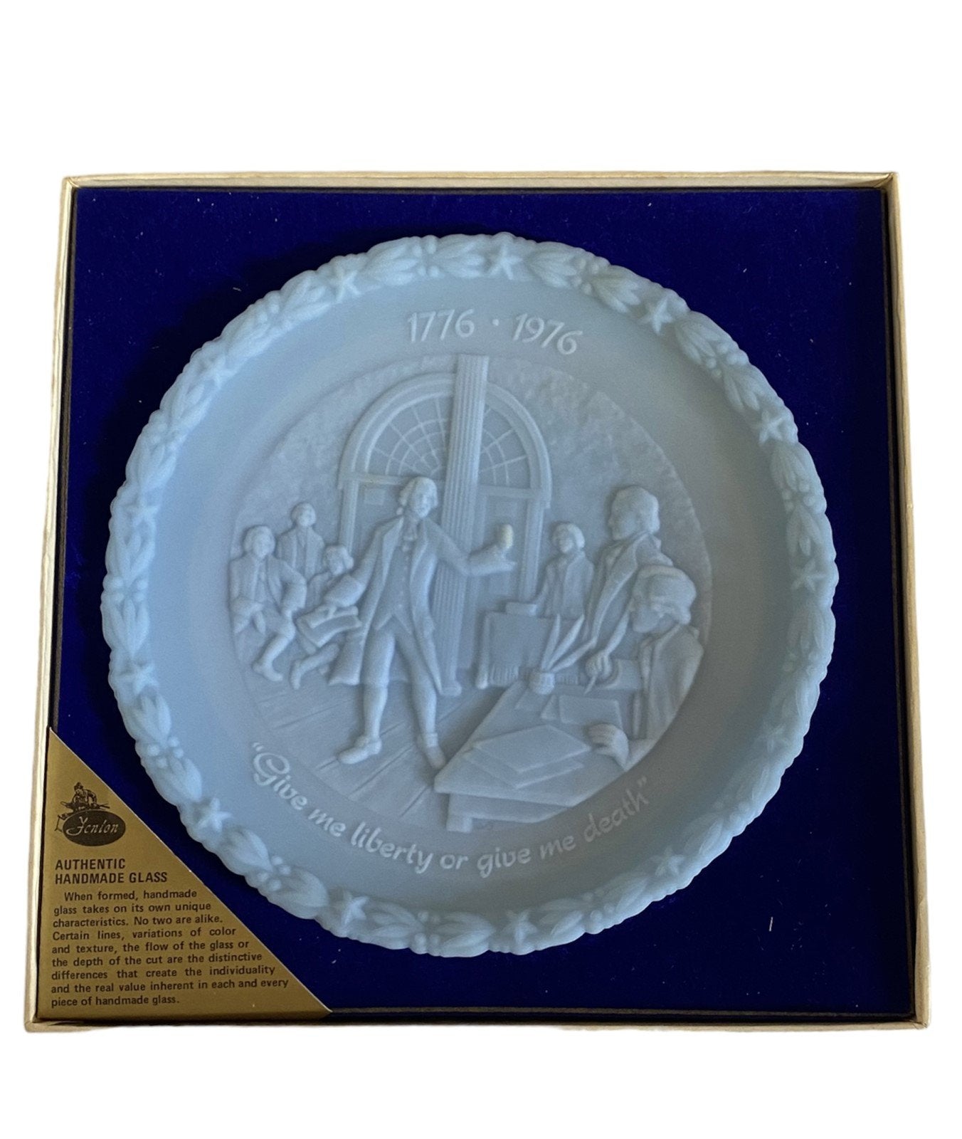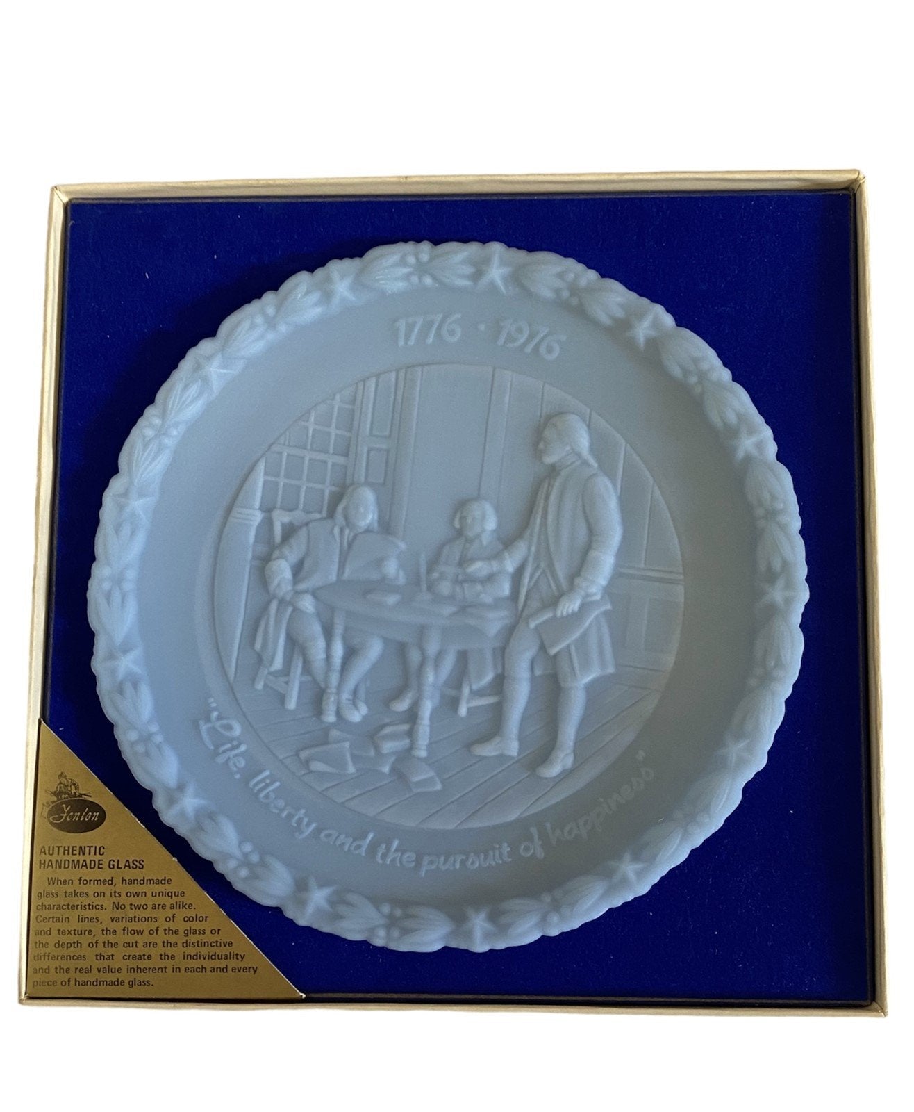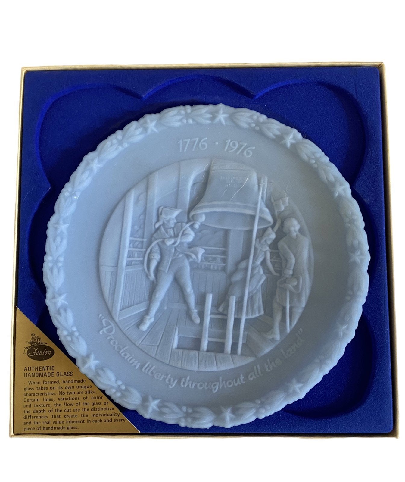 Antique Fenton Bicentennial Commemorative Liberty Plate Set. Four plates total in amazing condition. Each plate has tissue paper, a box, and authenticity cards.Take a look at the pictures for the best description. A photo is as good as a thousand words and is the best description of cosmetic condition. Use your ZOOM TOOL to best see this item! Please look closely at the photos for condition answers.