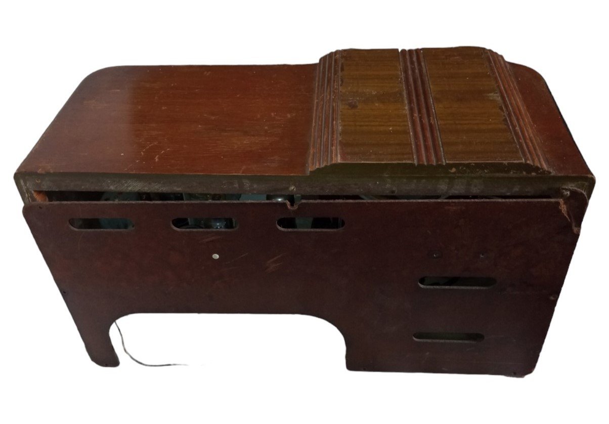 This is a vintage Firestone Air Chief radio likely made around the 1940s. There is severe damage in various places, mostly cracks in the wood. It does not appear to power on. This is a great item for any aspiring collector and makes a perfect piece of nostalgic decor!