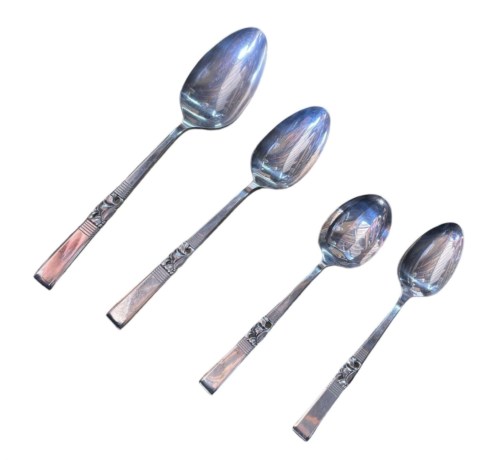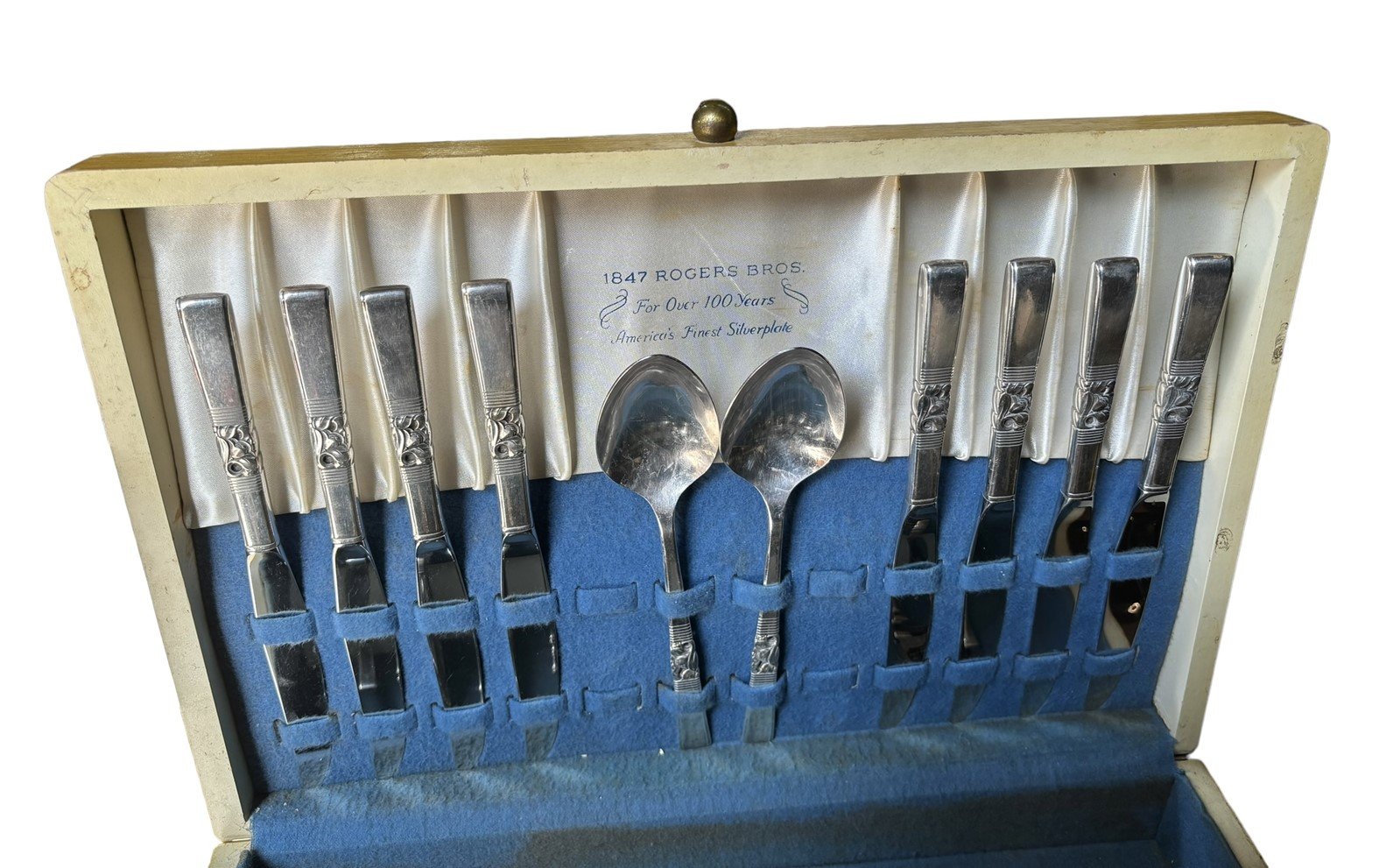 Flatware Set from Oneida Community in the Morning Star Pattern. Made of Silverplate in 1948. Set comes in a wooden Rogers case with blue felt lining. Set has 48 gorgeous pieces: 8 dinner knives, 2 serving spoons, 1 butter spreader, 1 soup spoon, 4 table spoons, 16 teaspoons, 8 salad forks, and 8 dinner forks. The pattern is so pretty and a perfect addition to any place setting!Take a look at the pictures for the best description. A photo is as good as a thousand words and is the best description of cosmetic condition. Use your ZOOM TOOL to best see this item! Please look closely at the photos for condition answers.