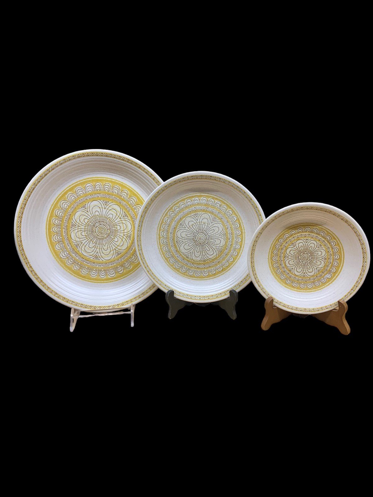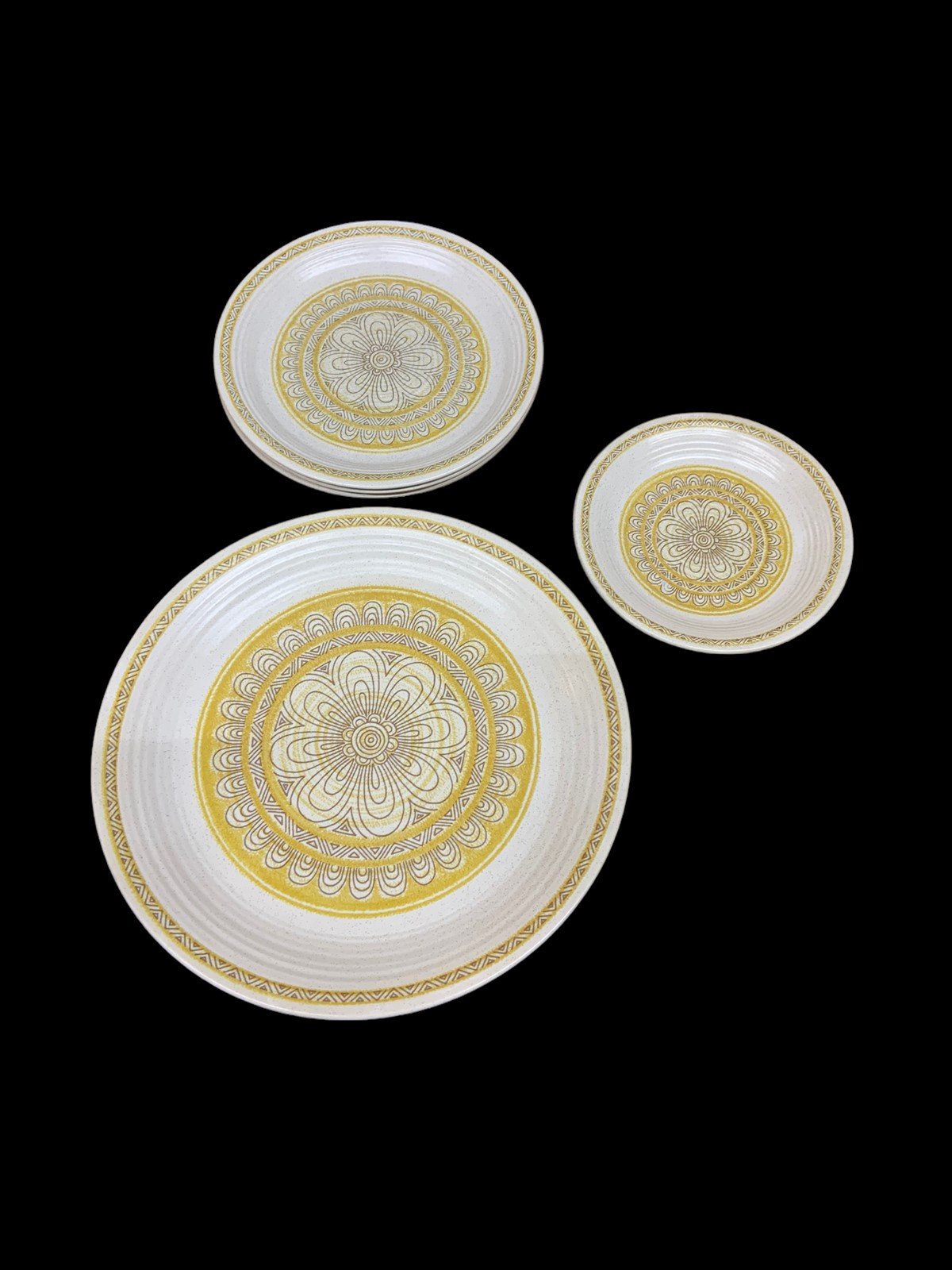 Set of 8 Gorgeous Fransican Hacienda Gold Earthenware Plates. Comes with (1) 6.5 inch salad plate. (3) 8 inch lunch plates, and (4) 10.5 inch dinner plates. These plates are pre-owned, but in perfect condition! The print is a stunning gold mandala, that really emulates Mid Century design!Take a look at the pictures for the best description. A photo is as good as a thousand words and is the best description of cosmetic condition. Use your ZOOM TOOL to best see this item! Please look closely at the photos for condition answers.