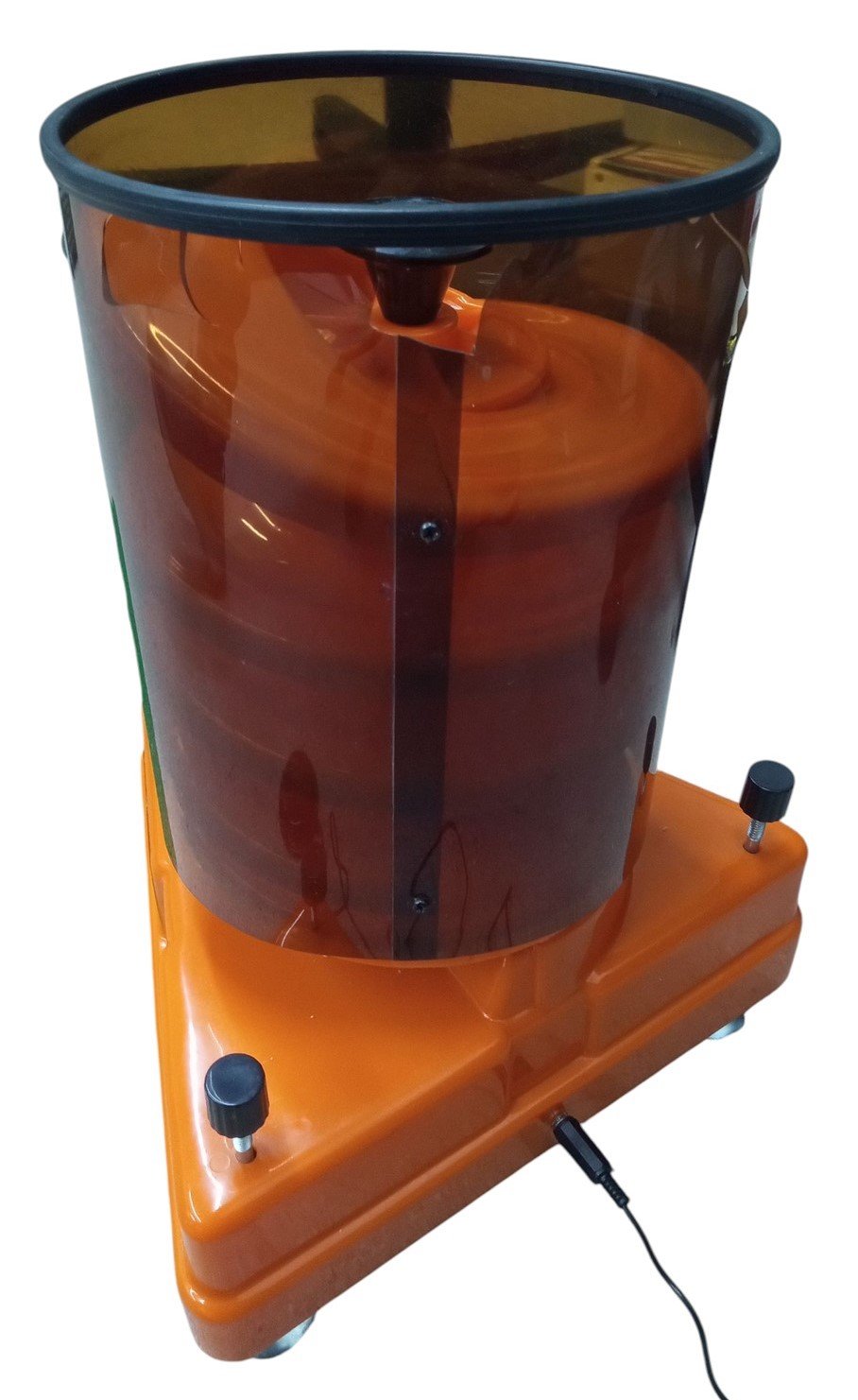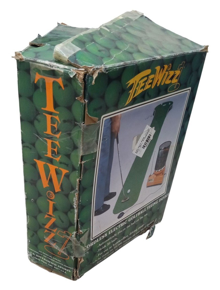 This is a vintage Tee Wizz automatic golf teeing device likely made around the late 1970s or early 1980s. The box has dents and tears. The mat has some loose threads. The shell around the golf ball spiral has some holes. This is untested. This is a great item for any aspiring collector and is a perfect gift for any golf enthusiast! The box measures about 12" by 12" by 16", the mat measures about 23" long by 10" wide, and the device itself measures about 11" by 10" by 16".