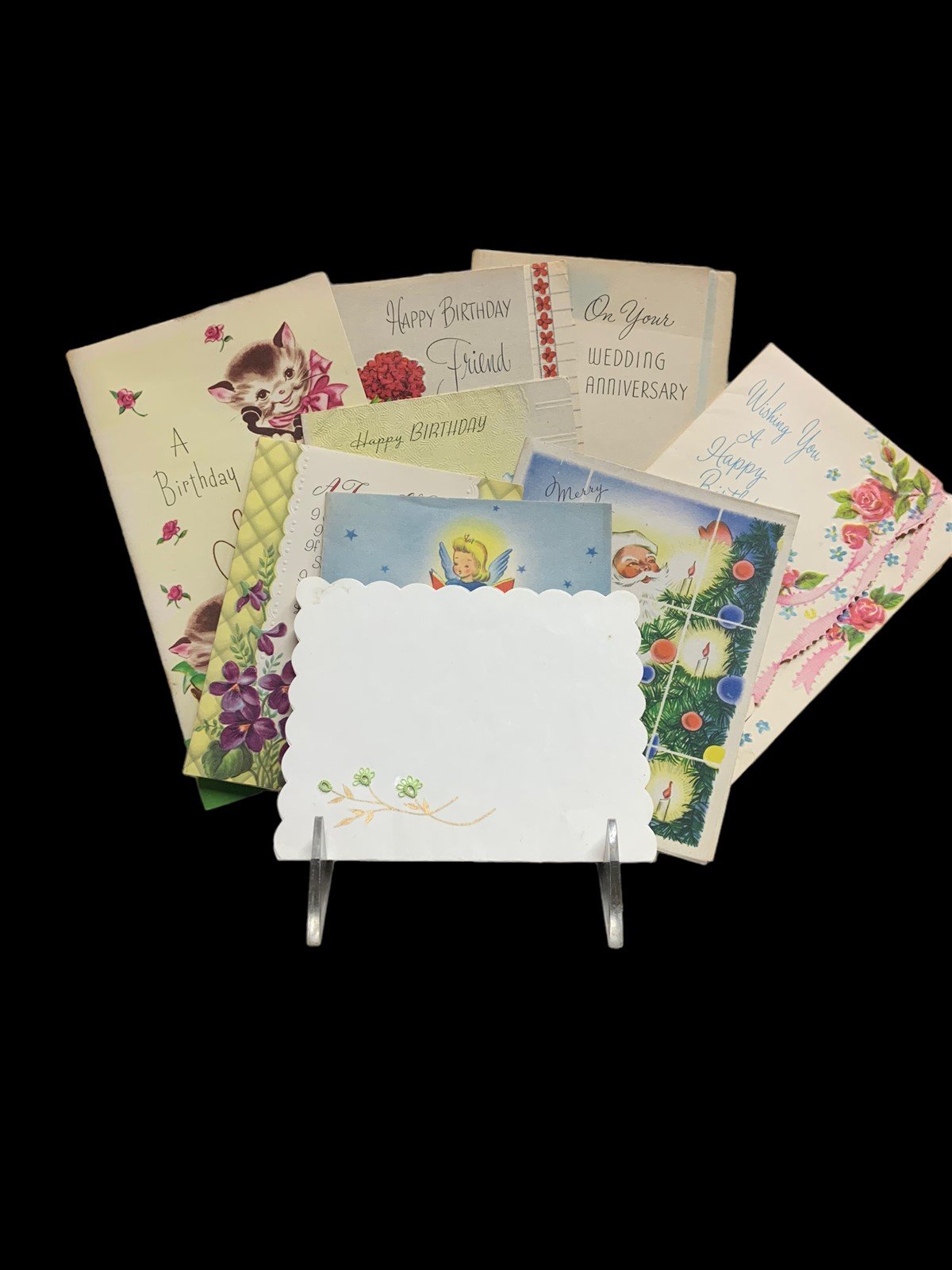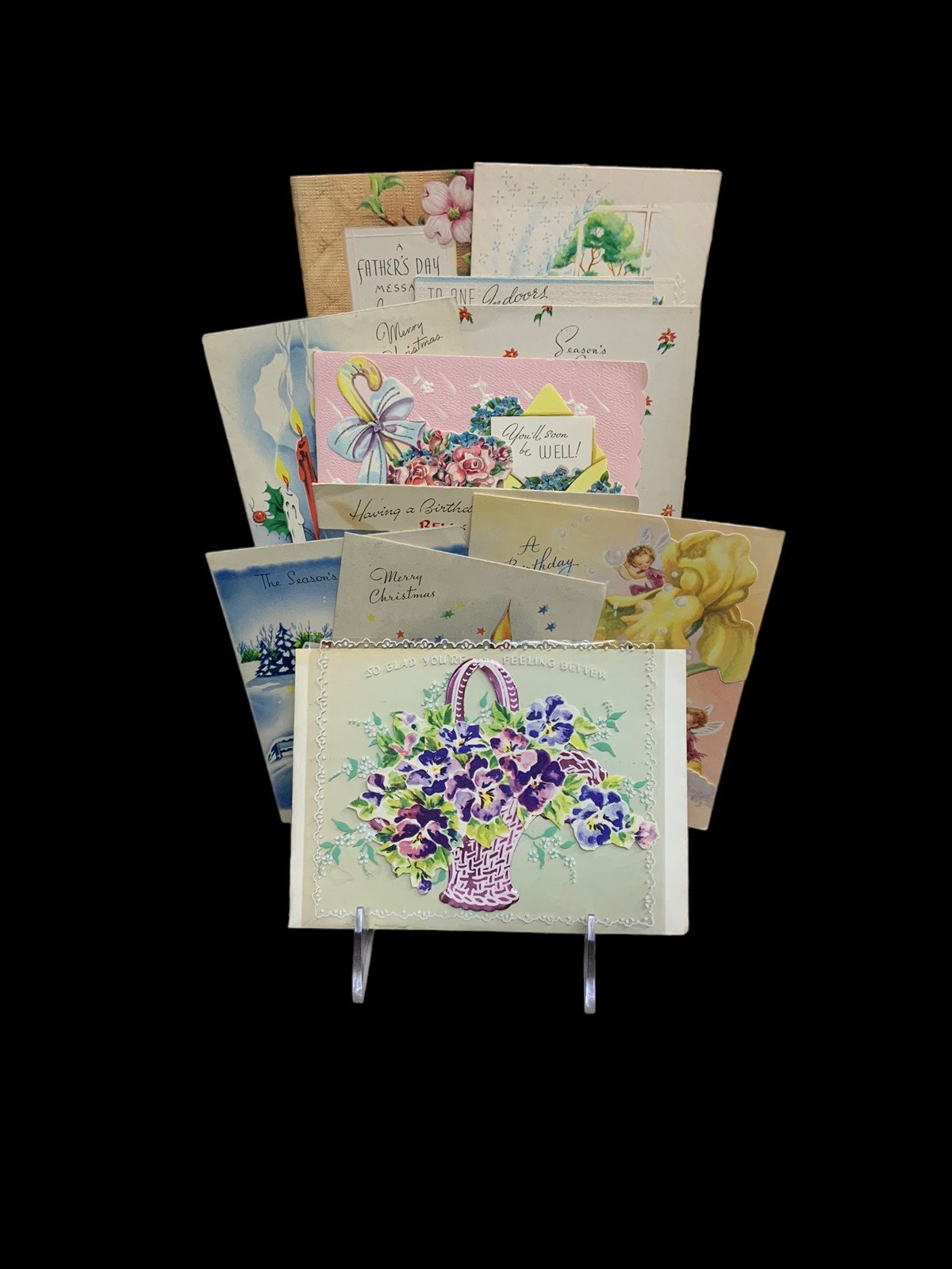 Lot of 35 Vintage Greeting Cards. These cards are each so cute! They are vintage, but unused! In this lot, there are 9 Christmas cards, 12 birthday cards, 5 Get Well Soon cards, and 9 other cards for various occasions. The cards vary in shape, design, and inside messages. See pictures for examples.Take a look at the pictures for the best description. A photo is as good as a thousand words and is the best description of cosmetic condition. Use your ZOOM TOOL to best see this item! Please look closely at the photos for condition answers.