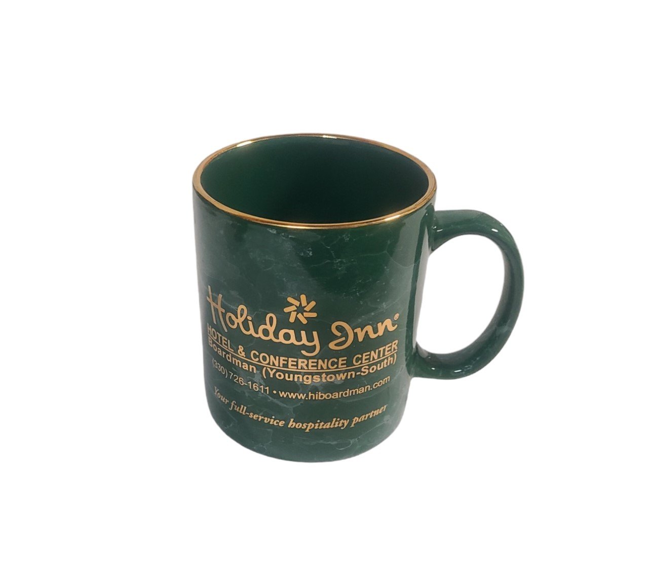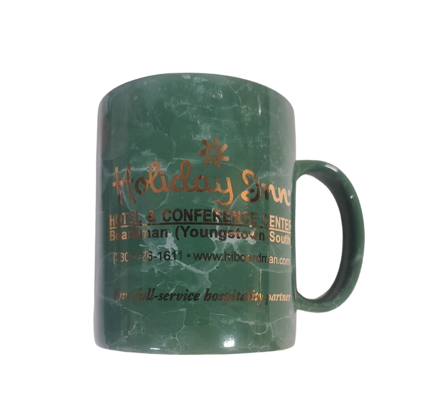 Raise a glass to "your host from coast to coast," the Holiday Inn! This elegant, souvenir mug is from the famous hotel chain's Youngstown, Ohio location. The mug is a deep green, marbled color with golden font and a gold rim. The mug was made to promote the Northeast Ohio branch of the Hotel & Conference Center, with their phone number and website on the front. The verbiage is completed with a friendly slogan, "Your full service hospitality partner." The mug appears to be in excellent vintage condition, with no apparent chips, cracks or defects. Origin date unknown, est. 1990s. Take a look at the pictures for the best description. A photo is as good as a thousand words and is the best description of cosmetic condition. Use your ZOOM TOOL to best see this item! Please look closely at the photos for condition answers. We describe items as best we can and as we see them. Some details may be missed but not intentionally. Condition of an item is our opinion. If you have any questions on the condition of these items let us know before you purchase! Thanks for looking!-
