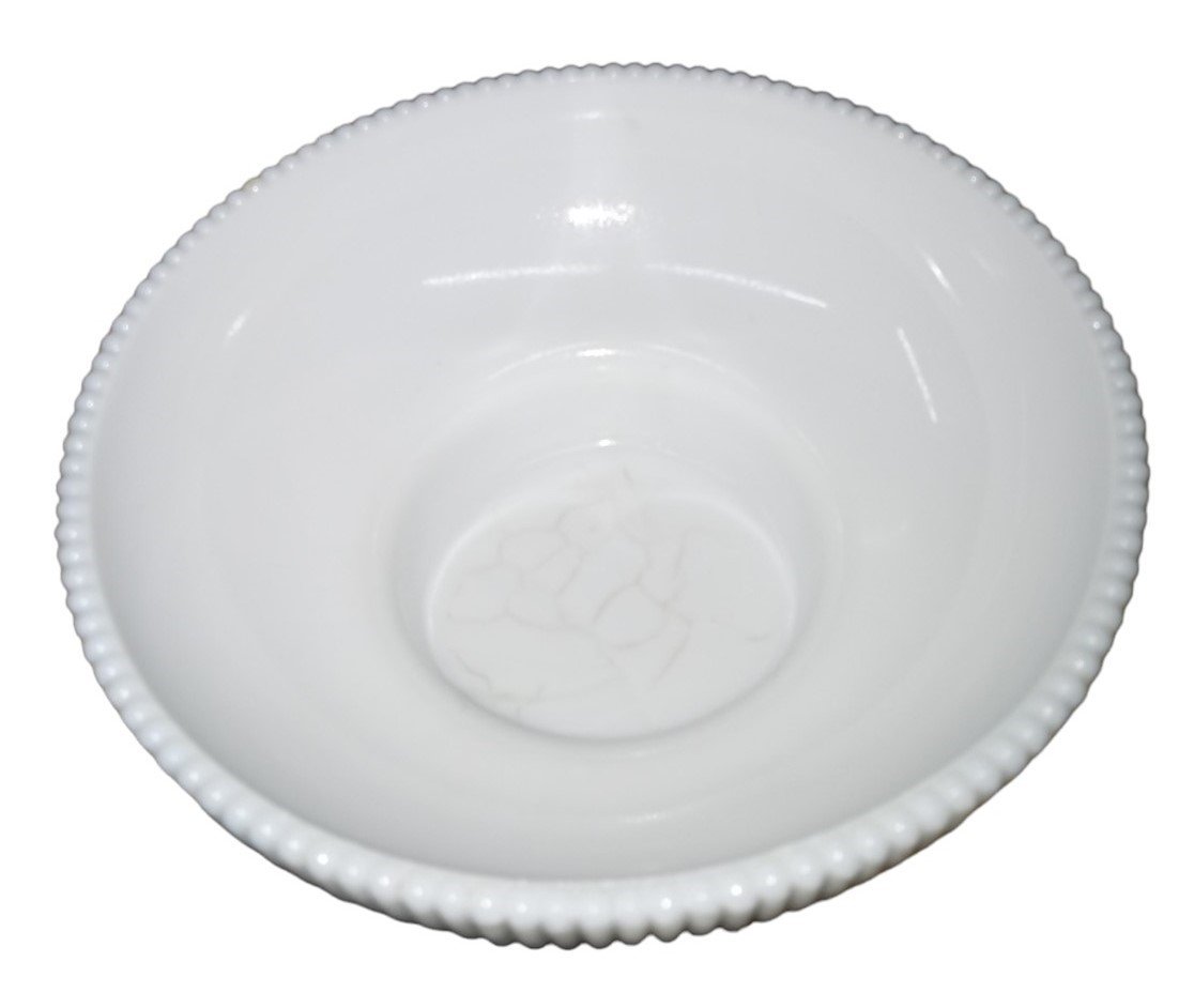 This is a vintage milk glass bowl made by Hoosier Glass likely around the 1960s. Some minor yellow grime is visible but otherwise this is undamaged. This is a great item for any aspiring collector and is a perfect fit in any glass collection! This measures about 7" by 7" by 3".