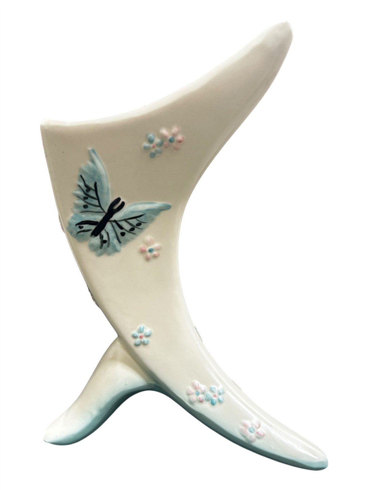 This is a lot of butterfly Hull Pottery manufactured in 1956. The lot includes a pair of candleholders, a cornucopia vase, an ashtray, a rectangular tray, and a basket. The set has minor wear, as seen in the pictures. This would be a wonderful addition to any collector of mid-century delights!