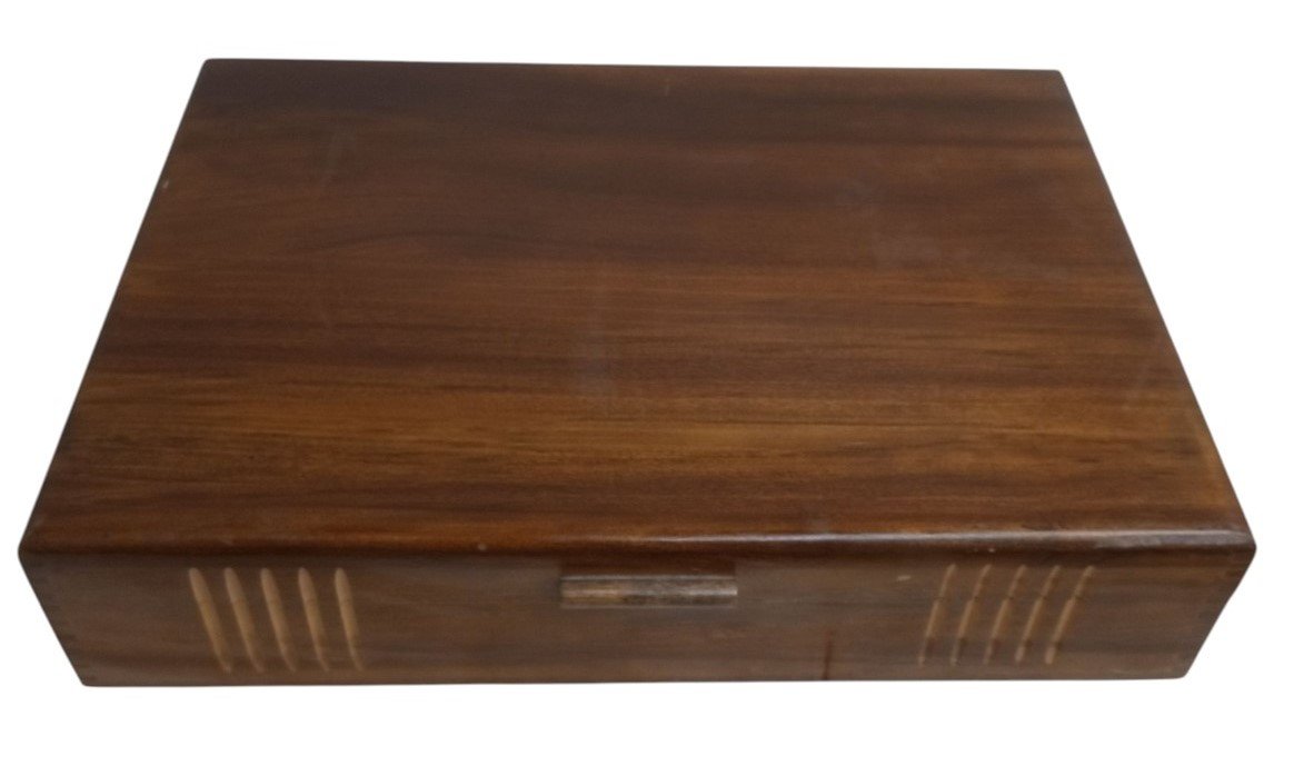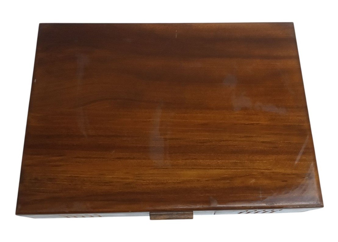 This is a Princess Lady Doris silverware set released by International Silver likely around the 1940s. Condition varies from piece to piece but most only show minor marks and spots of discoloration. The box has visible marks and scratches. This set is great for any aspiring collector and is perfect for filling out your silverware collection! This set includes 12 teaspoons (about 6" long) 12 iced tea spoons (about 8" long) 12 soup spoons (about 8" long) 11 salad forks (about 6" long) 1 cold meat fork (about 8" long) 1 butter knife (about 6" long) 12 French hollow knives (about 9.5" long) 2 sugar spoons (about 5.5" long) The box measures about 15" by 11" by 3"