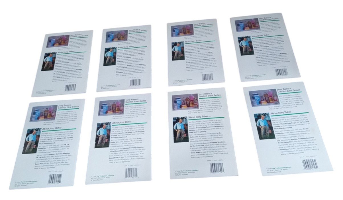 This is a set of Jerry Baker's New Line Garden books published in 1994. The box shows some minor marks and tears. The books themselves are in great condition. This is a great set for any aspiring collector and is a perfect fit in any book collection! This set makes a great Christmas gift! Each book measures about 9" by 5.5" by 0.5", and the box measures about 9" by 6" by 1".