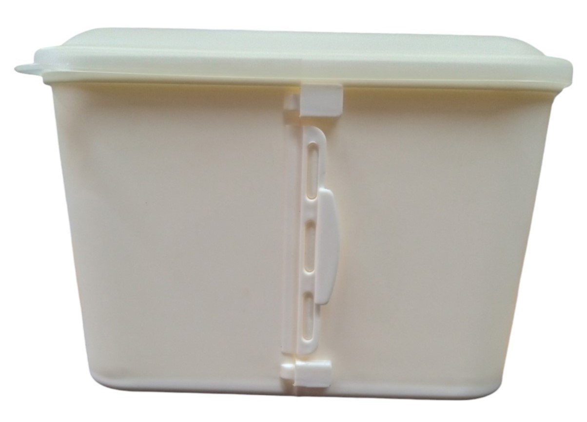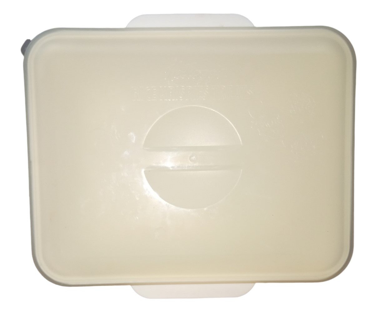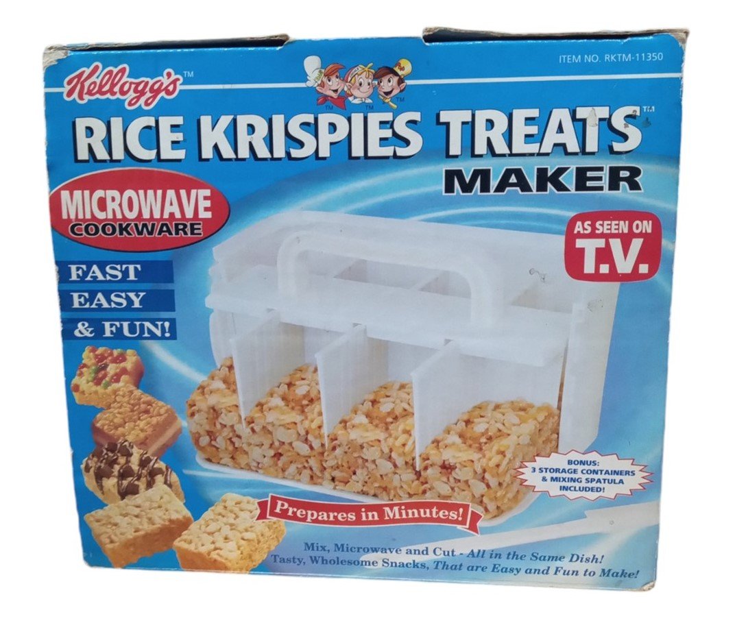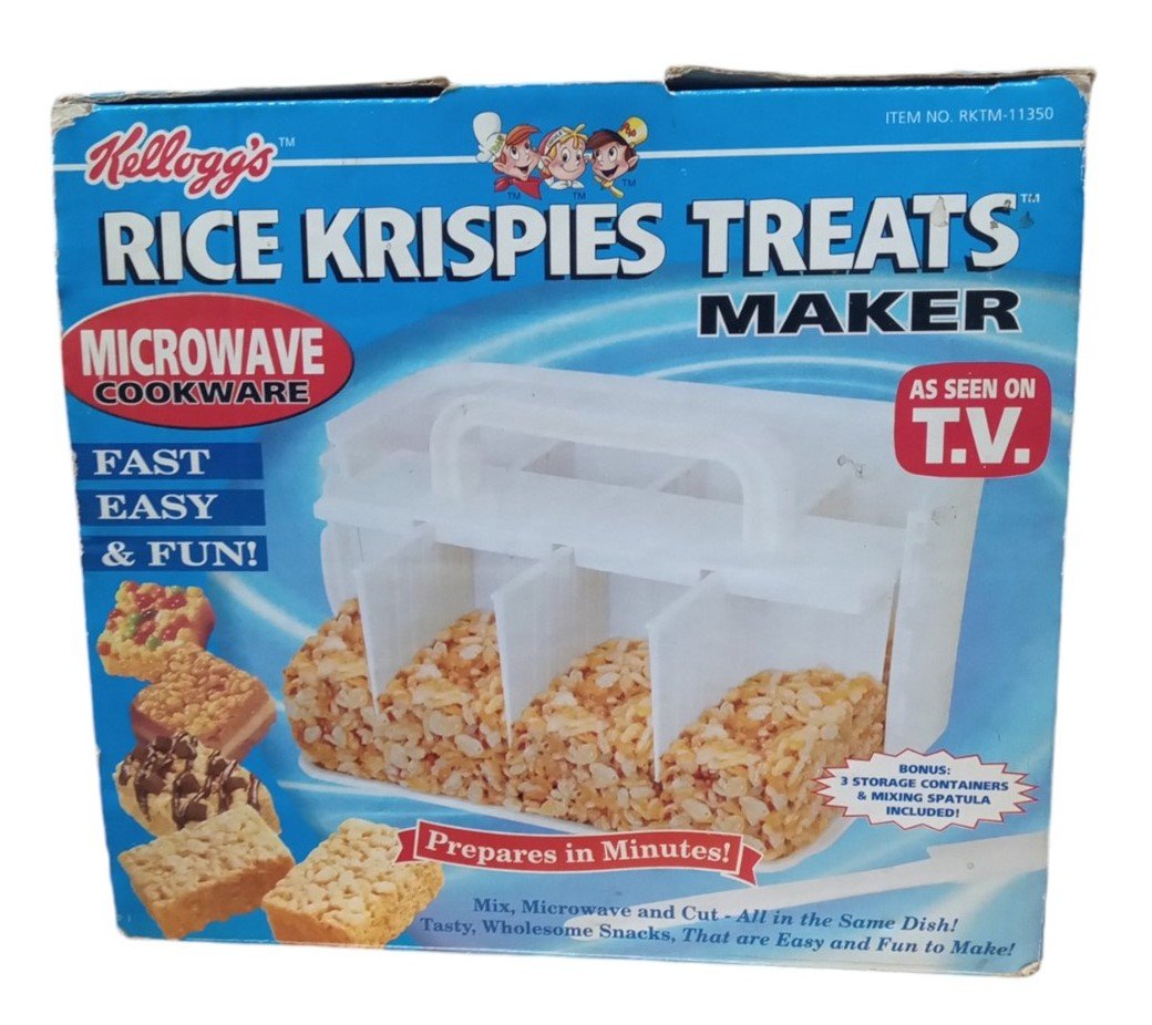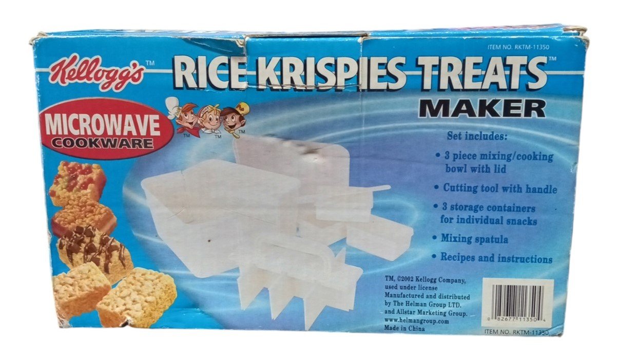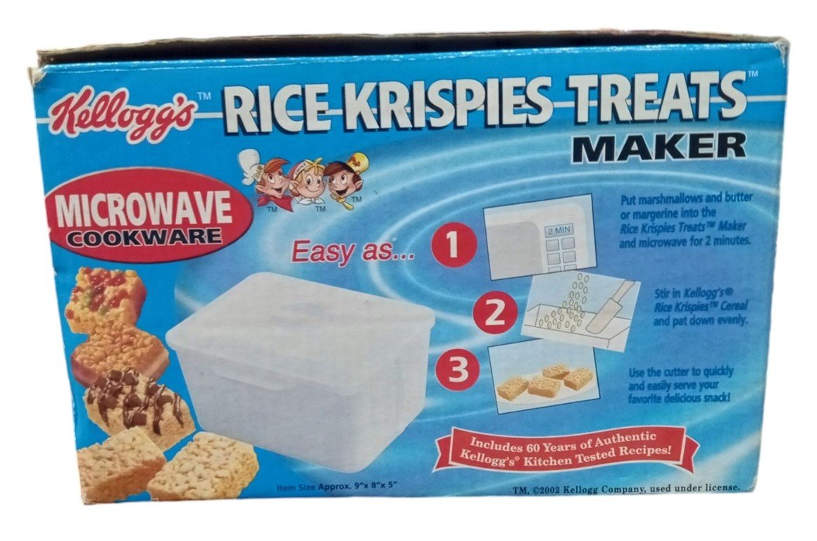 This is a microwave Rice Krispies Treat maker made by Kellogg's in 2003. It is missing the mixing spatula. The included pieces are in good condition for their age. The box has some minor marking on the corners but is otherwise in good condition. This is a great item for any aspiring collector and is a perfect fit in any kitchen! This measures about 9" by 5" by 8".