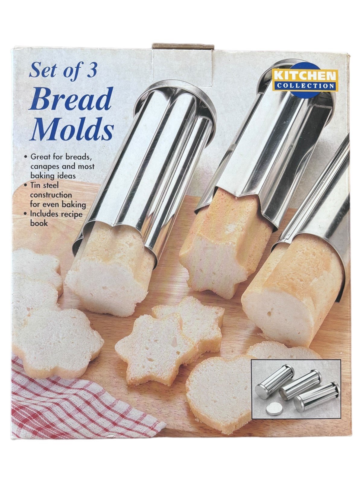 This is a set of 3 bread molds made by kitchen collection. The molds are of a flower, a heart, and a star. They are all in great condition. the box measures 10 1/4in x 9in x 3in.Take a look at the pictures for the best description. A photo is as good as a thousand words and is the best description of cosmetic condition. Use your ZOOM TOOL to best see this item! Please look closely at the photos for condition answers.