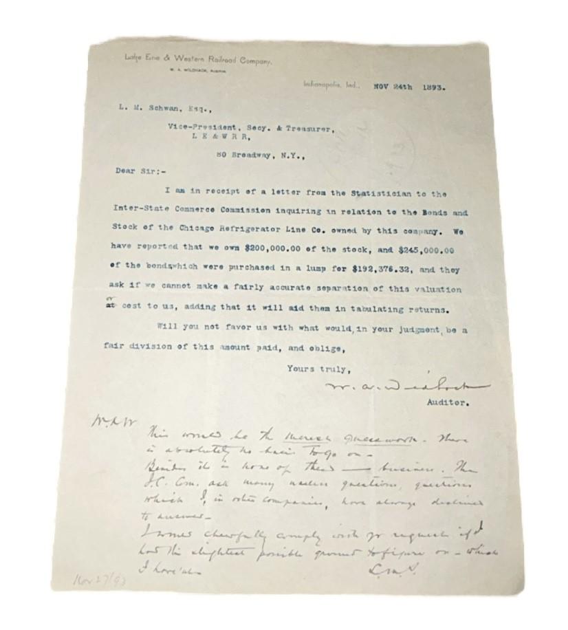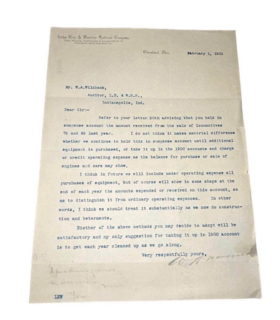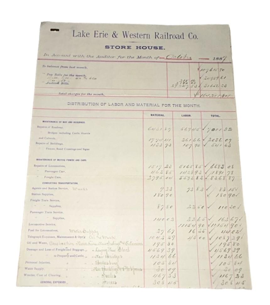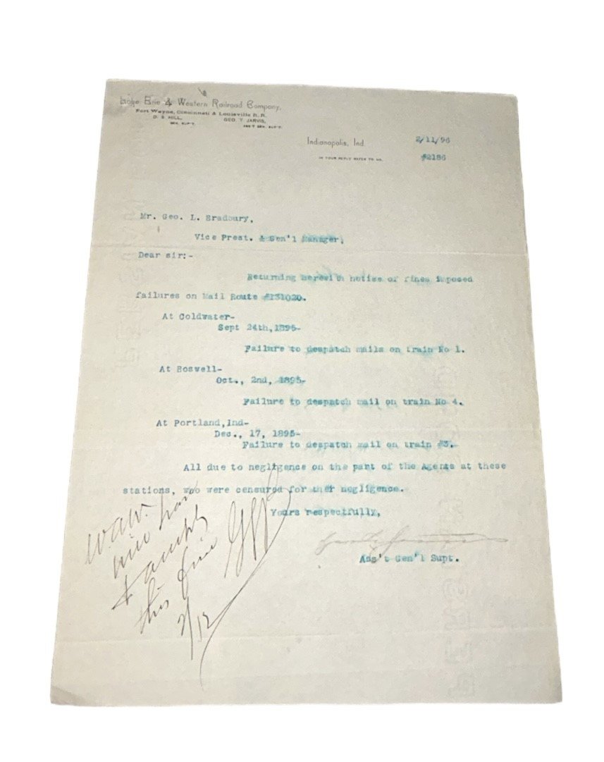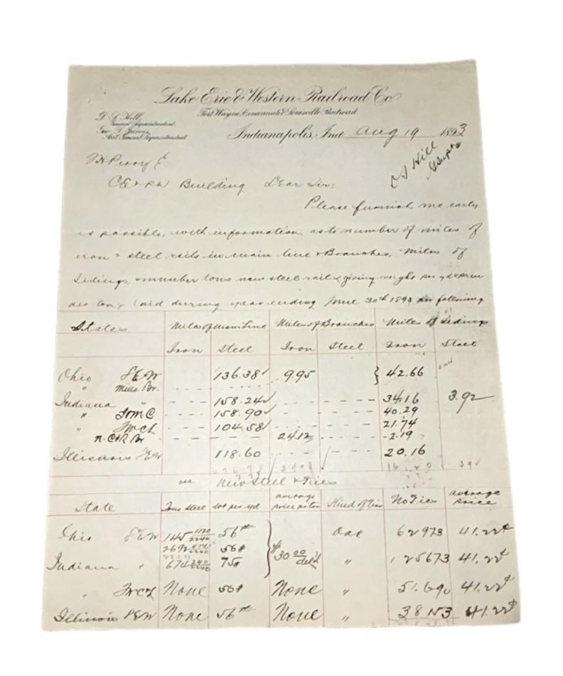 Up for sale was a nice collection of antique paper from the late 1800s early 1900s from the lake Erie and western railroad company. Included in the lot is a statement of claim certificates most likely from picking up mail. Also a letter from the vice president concerning owing stock of over a half $1 million which was a lot of money back in 1893 along with a receipt of steel and iron and other things picked up. Also included is a letter about fines for failure to collect mail, the sale of locomotives, and a two page letter from 1887 that accounts for maintenance And other expenses by the railroad. I’ve also thrown in two unused interchange reports from the Indianapolis Union railway company. This is a really nice collection.Take a look at the pictures for the best description. A photo is as good as a thousand words and is the best description of cosmetic condition. Use your ZOOM TOOL to best see this item! Please look closely at the photos for condition answers.