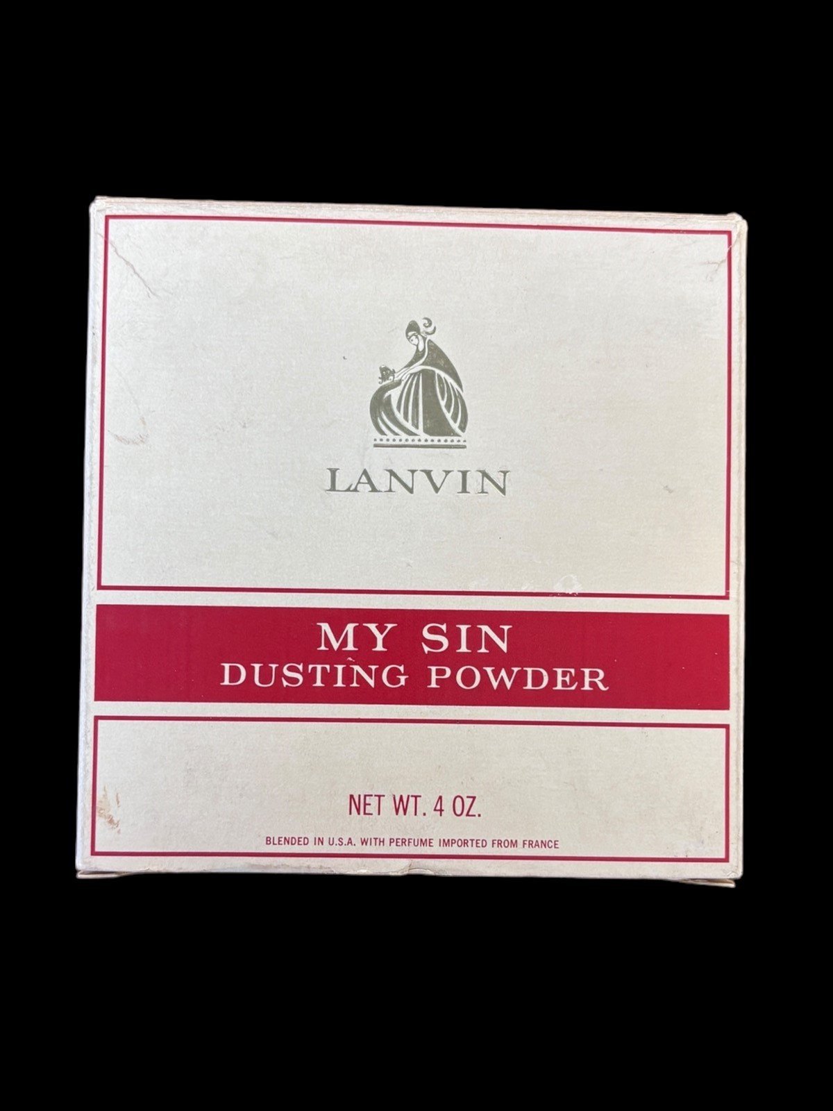 This is Lanvin My Sin dusting powder blended in the USA with perfume imported from France. Net WT. 4 OZ. The powder is still sealed and unused. The box measures 5in x 5in x 2 1/2in.Take a look at the pictures for the best description. A photo is as good as a thousand words and is the best description of cosmetic condition. Use your ZOOM TOOL to best see this item! Please look closely at the photos for condition answers.