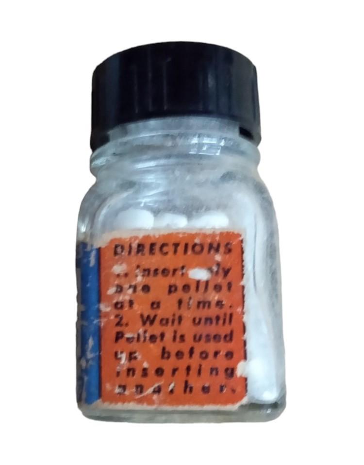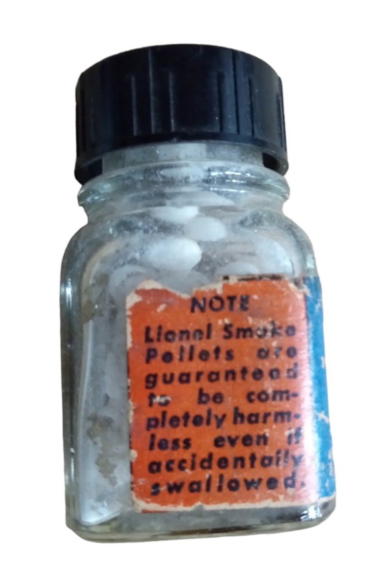 This is a bottle of vintage smoke pellets made by Lionel likely around the 1960s. The label is beginning to tear slightly. It appears that 15 pellets are still in the bottle. This is great for any collector and is perfect for any Lionel train enthusiast!