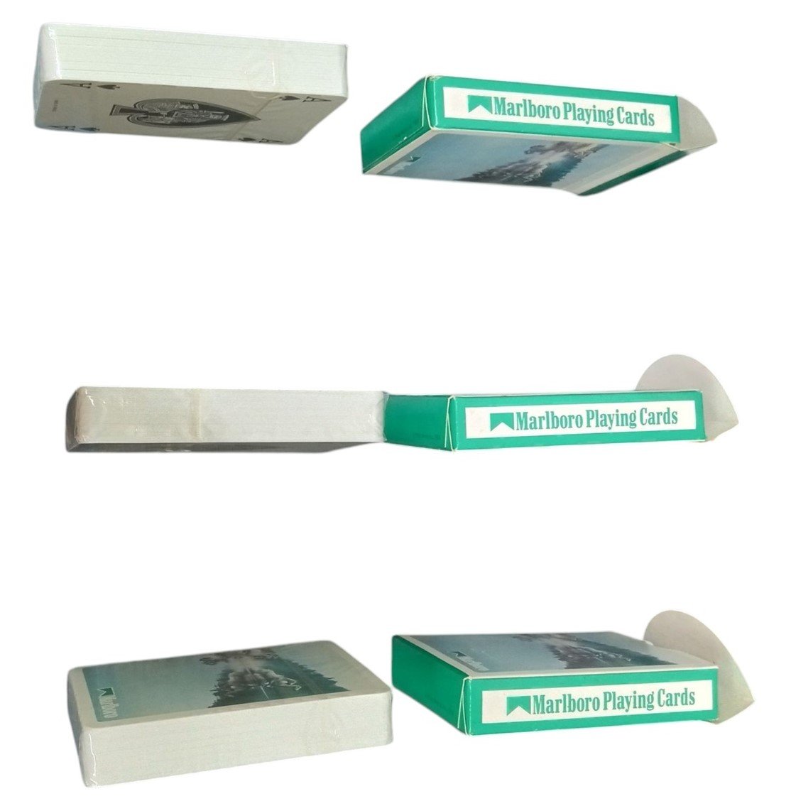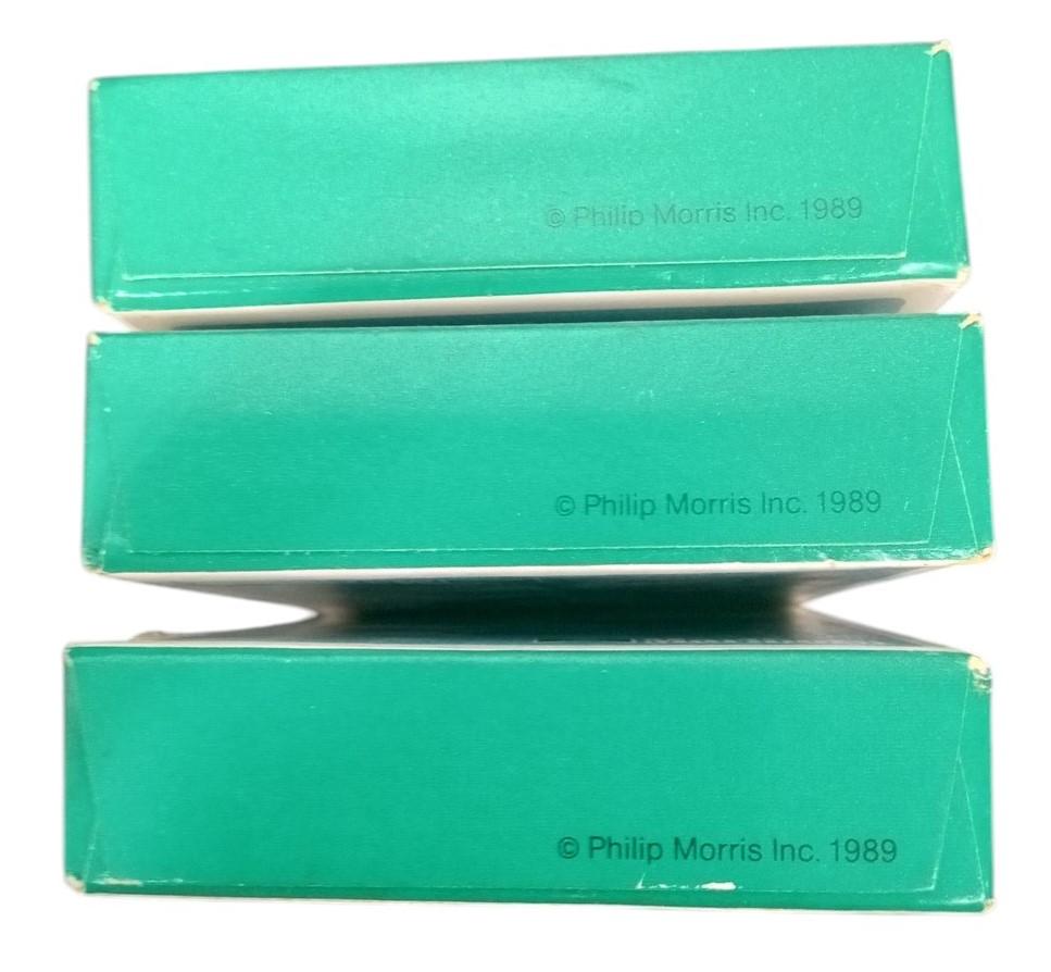 This is a set of 3 Marlboro playing card decks released in 1989. The boxes have visible marks and stains while the cards themselves are still sealed. This set is great for any aspiring collector and is perfect for any tobacciana enthusiast! Each deck measures about 3" by 2" by 1".