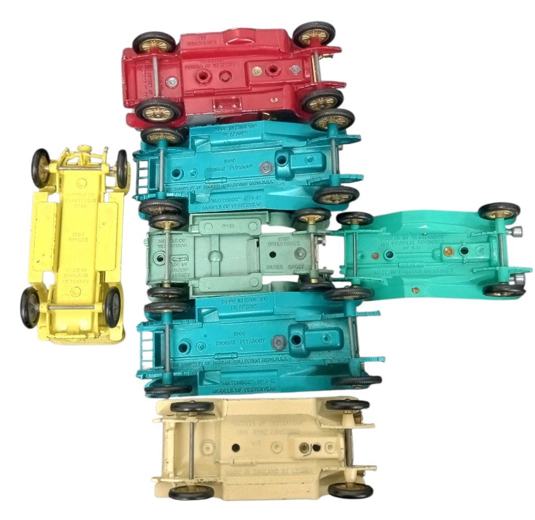 This is a set of Matchbox Models Of Yesteryear diecast cars likely made around the 1960s. Marks and scratches are visible. The 1907 Rolls Royce is missing seats. This set is great for any aspiring collector and is a perfect fit in any toy collection! This set includes 1904 Spyker (about 3.5" by 1.5" by 1.5") 1907 Rolls Royce (missing seats, measures about 3" by 1.5" by 1.5") x2 1909 Thomas Flyabouts (each measures about 3.5" by 1.5" by 1.5") 1910 Benz Limousine (about 3" by 1.5" by 1.5") 1911 Maxwell Roadster (about 3" by 1.5" by 1.5")