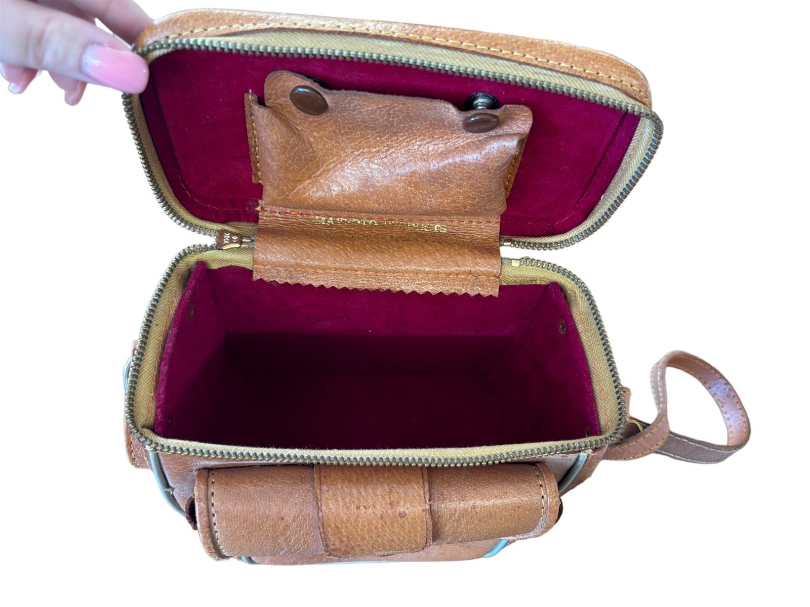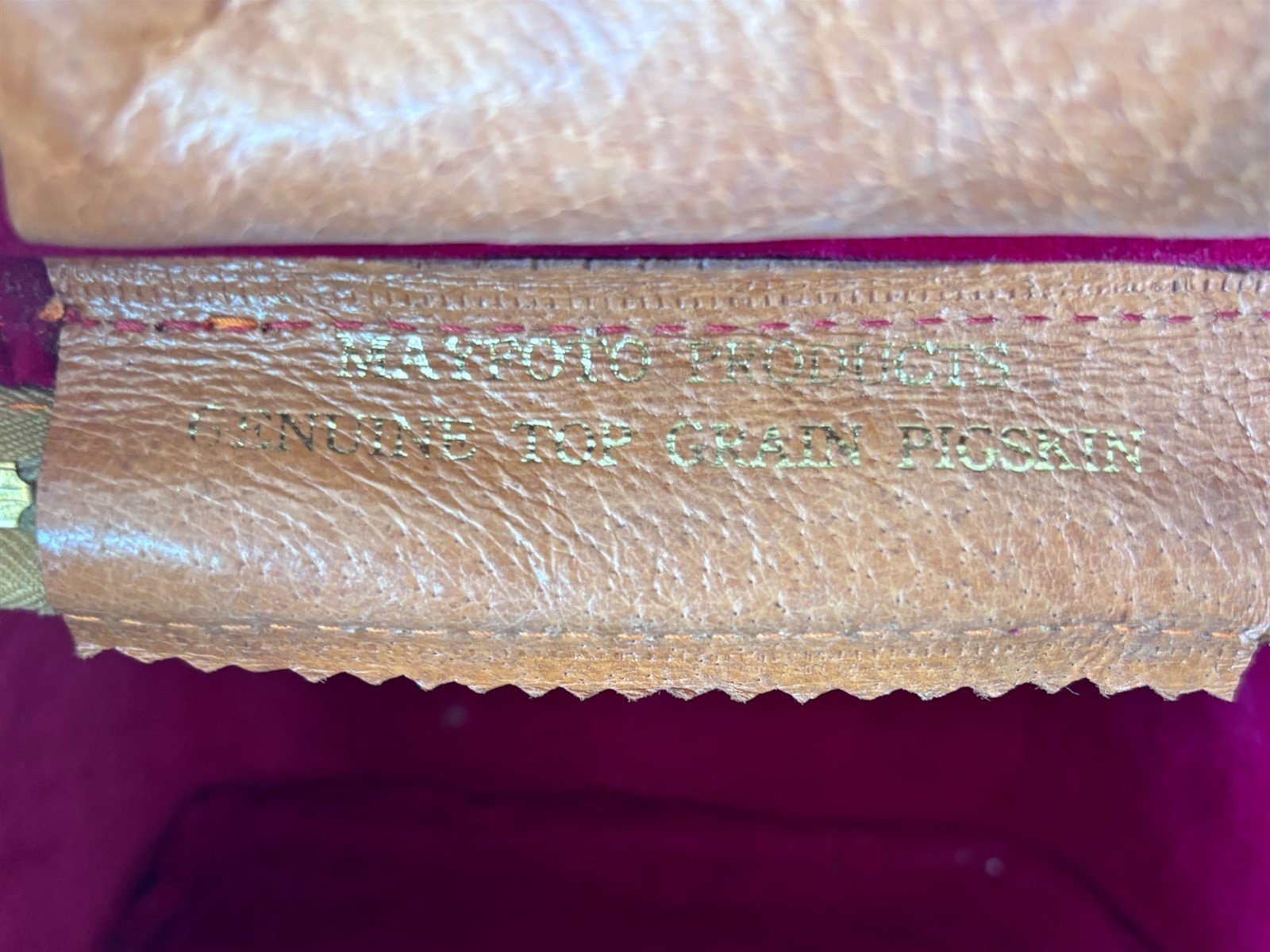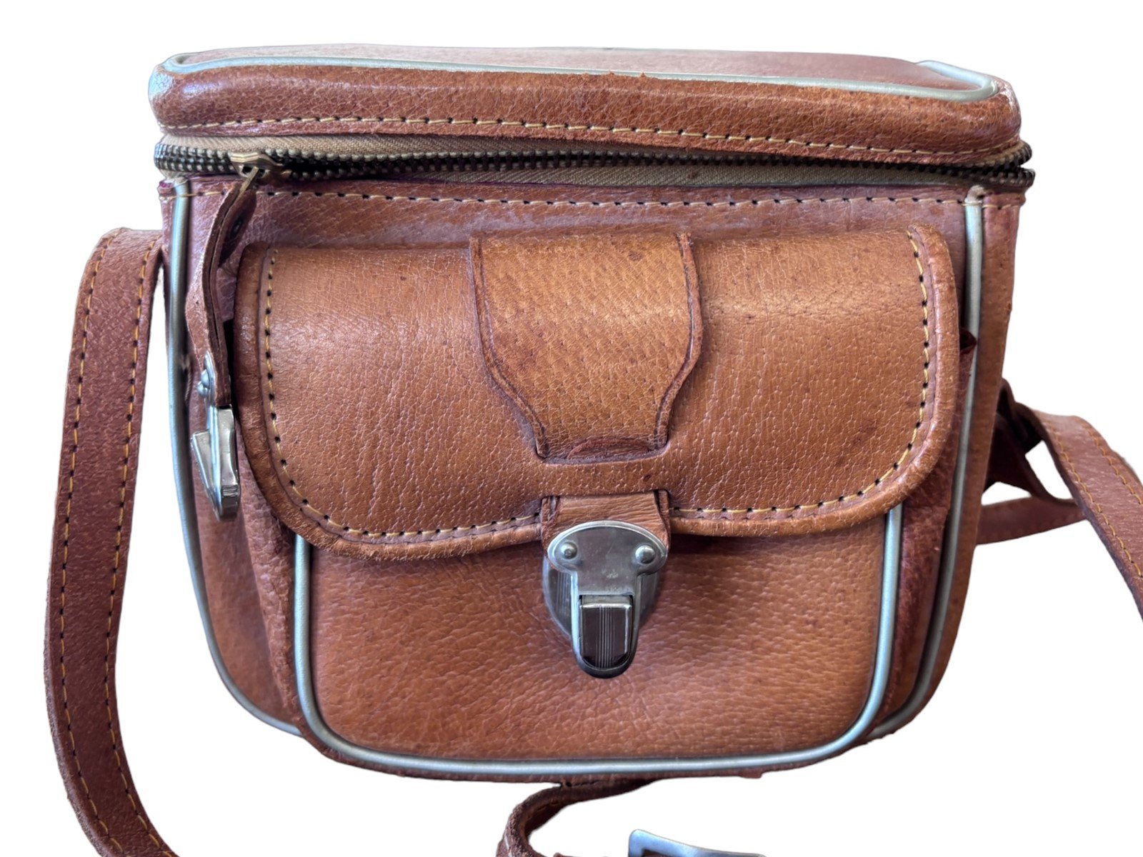 This is a Mayfoto camera bag made out of genuine pigskin. It has a clasp on the zipper and on the frontal pocket. There is a pocket on the top inside of the bag that snaps shut. It's in good condition and measures 7in x 5in x 6 1/2in. The strap is adjustable.Take a look at the pictures for the best description. A photo is as good as a thousand words and is the best description of cosmetic condition. Use your ZOOM TOOL to best see this item! Please look closely at the photos for condition answers.