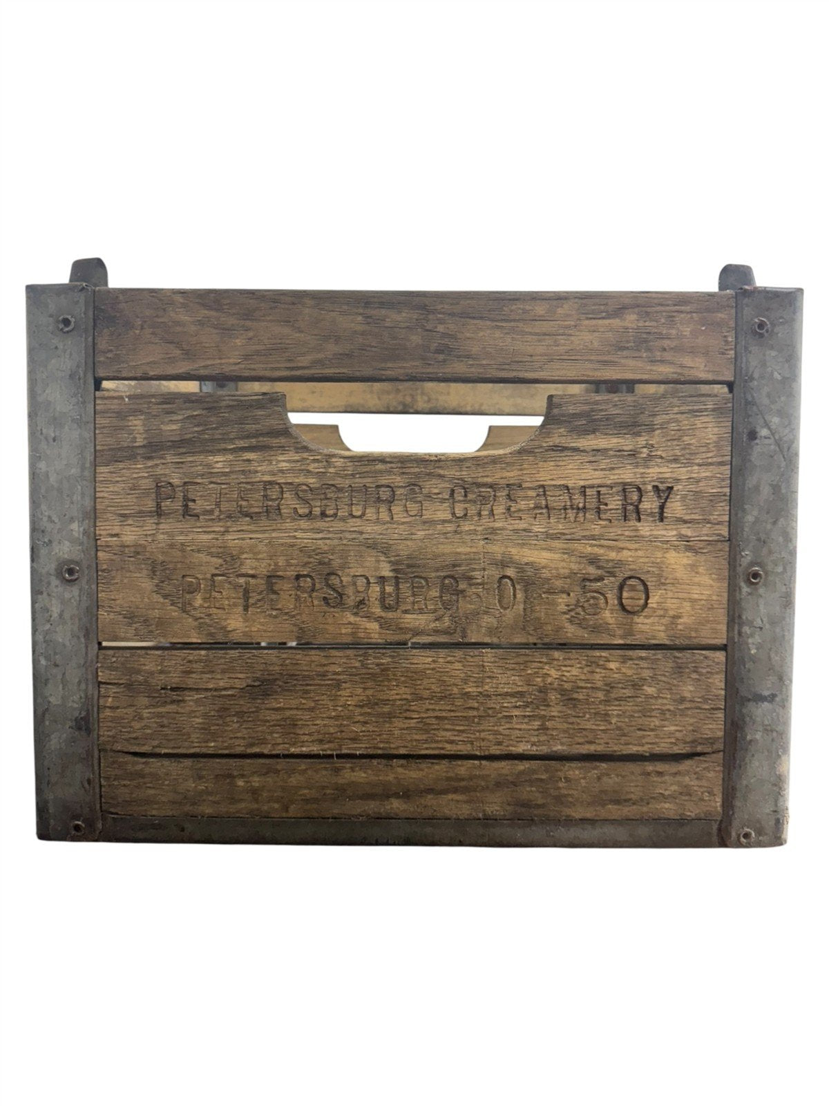 This is a beautiful vintage milk crate from the Petersburg Creamery in Petersburg, Ohio. This is one of several milk crates from the same creamery, so dates and condition might vary slightly. This piece would be great to store things in or add to an existing collection. The piece is in great condition with only some cosmetic damage to the wood. The crate is 15" x 12" x 12" and has slots for 12 milk bottles. This is a perfect piece for any collector!