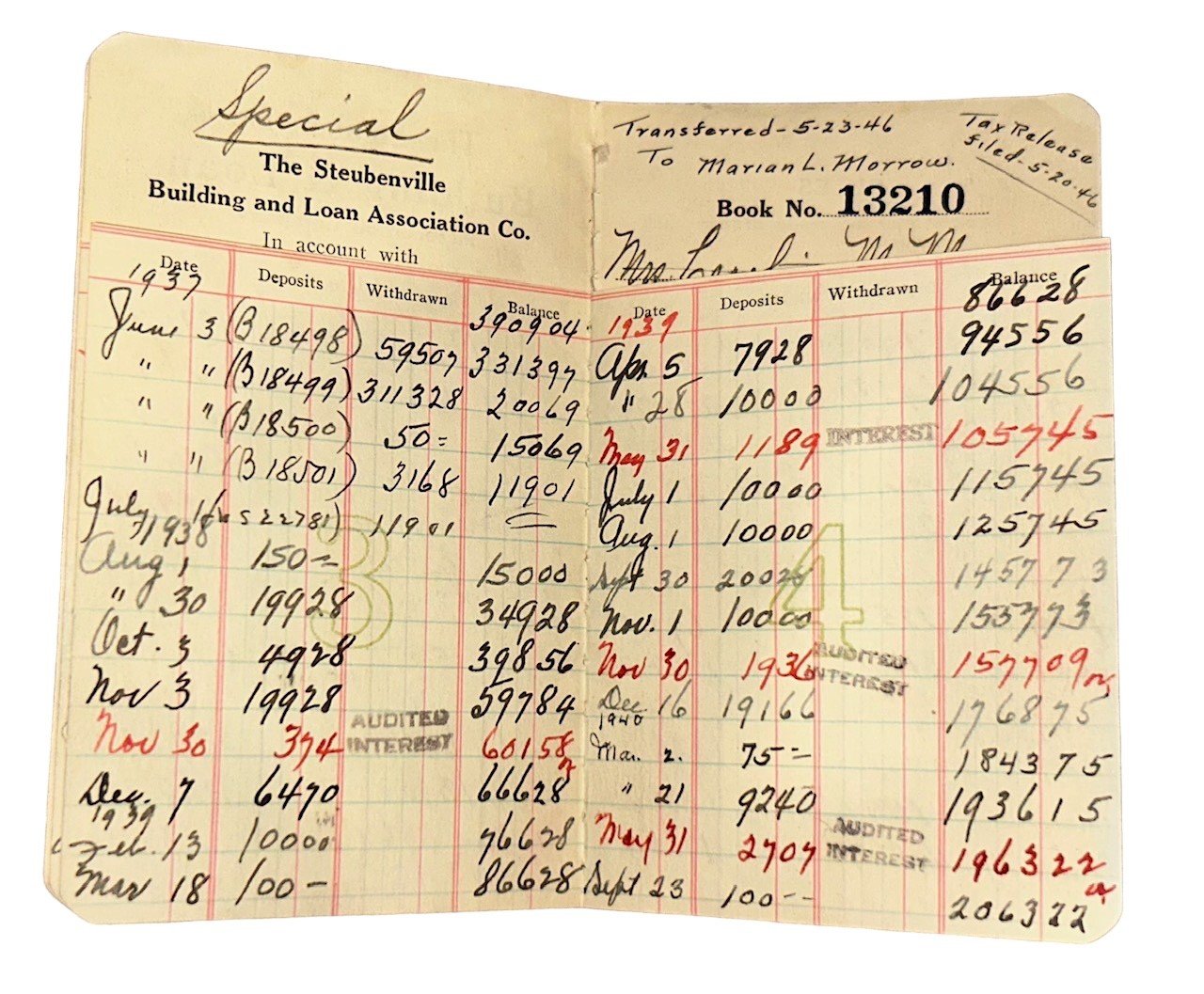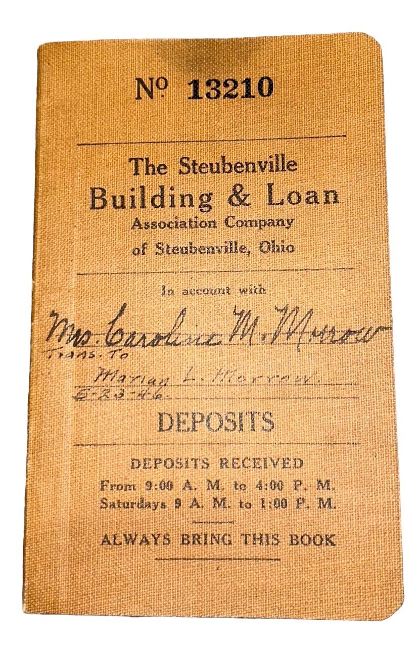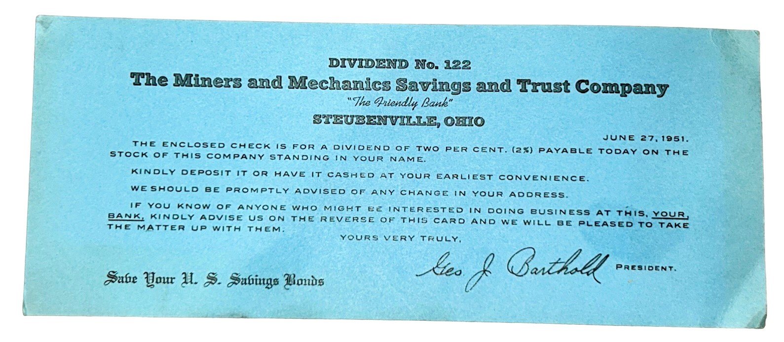This is a very collectible lot of Miners and Mechanics Banking and Steubenville Building and Loan items. The Steubenville deposit book was opened in 1933 and closed in 1946. There's a tax receipt holder from the Miners and Mechanics bank. A 1975 desk calender along with a divided voucher 2% payable on stock owned; signed by George Barthold, president of the bank. These items are almost 100 years old.Take a look at the pictures for the best description. A photo is as good as a thousand words and is the best description of cosmetic condition. Use your ZOOM TOOL to best see this item! Please look closely at the photos for condition answers.