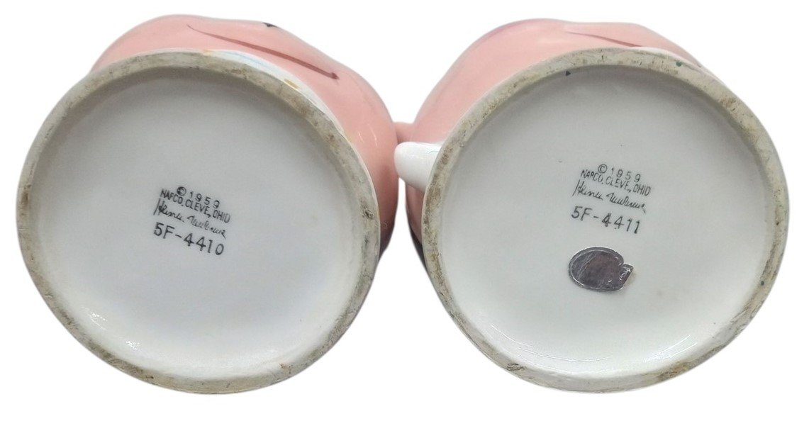 This is a set of vintage ketchup & mustard canisters made by Napco in 1959. Minor marks and scratches are visible. Some small chips are present. The ketchup canister has some small defects on the inside. This set is great for any aspiring collector and would make a lovely gift! Each canister measures about 4" by 3" by 5".