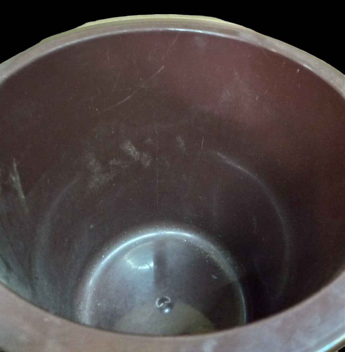 This is a vintage barrel shaped ice bucket made by Rubbermaid in the 1970s. At 9" deep, this bucket has plenty of room to hold all of your ice and beverages. This is perfect for any mancave or outdoor gathering! This measures about 9" by 9" by 11".