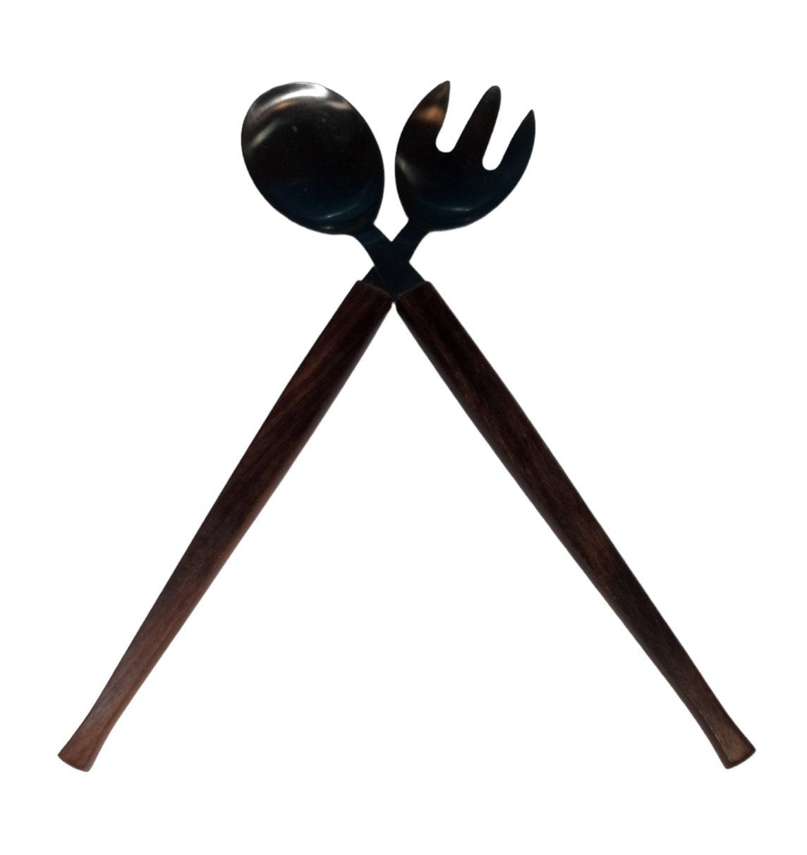 This is a teakwood stainless steel salad bowl set likely made in the 1980s. This set includes a bowl, a spoon and a fork. Each piece is in great condition only showing some minor scratches. This is a great addition to any kitchenware collection and is perfect for serving salads!