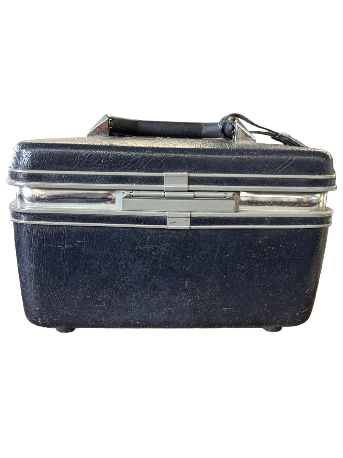 This makeup case is by Samsonite. It's black and has vintage wear. It doesn't have a key but it opens and closes fine without it. It's a deep navy blue color. The inside has a mirror which is in good condition. It's 8in x 14 1/2inx 11in.Take a look at the pictures for the best description. A photo is as good as a thousand words and is the best description of cosmetic condition. Use your ZOOM TOOL to best see this item! Please look closely at the photos for condition answers.