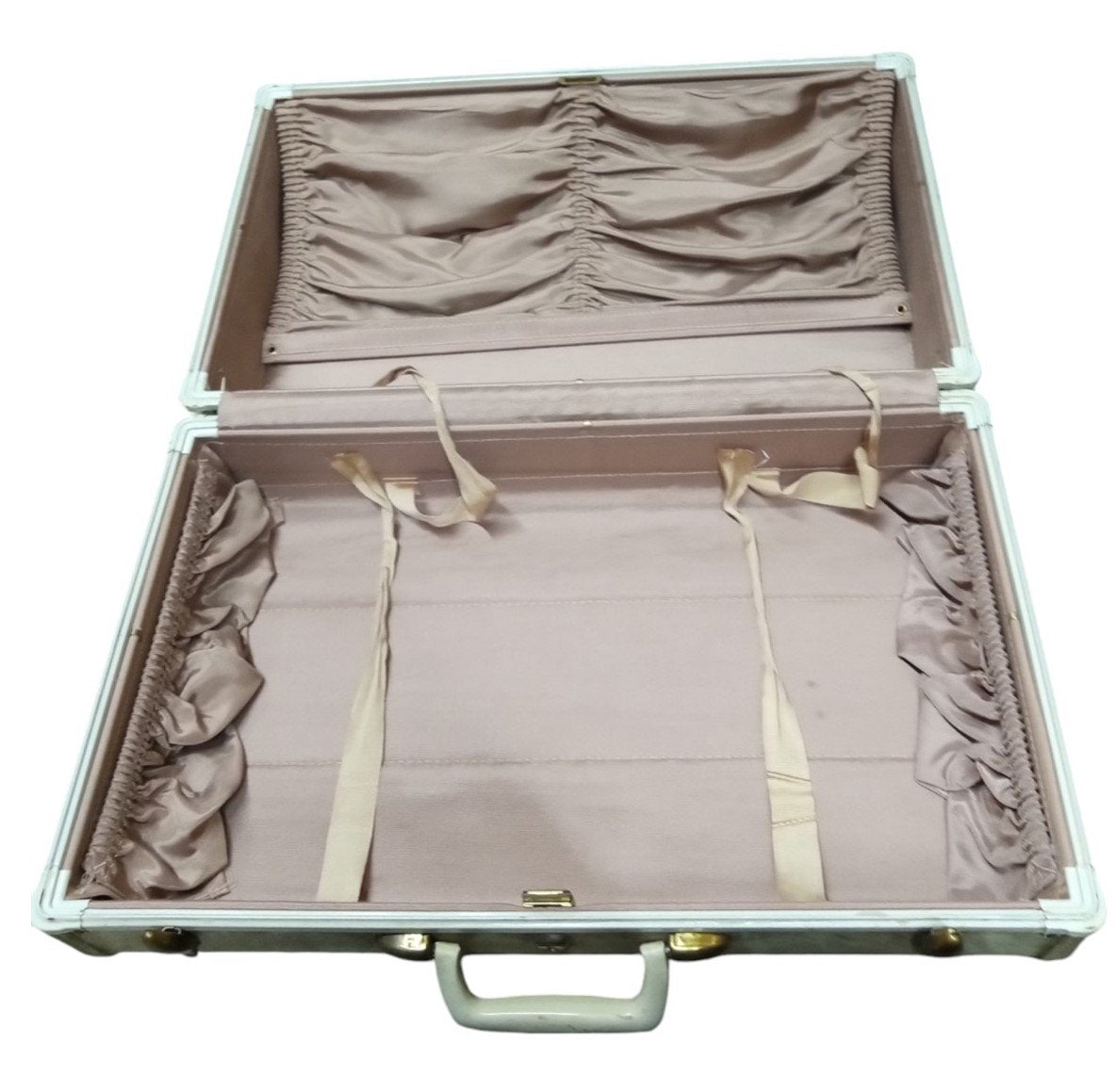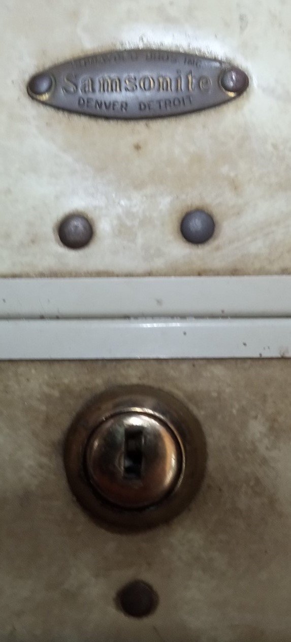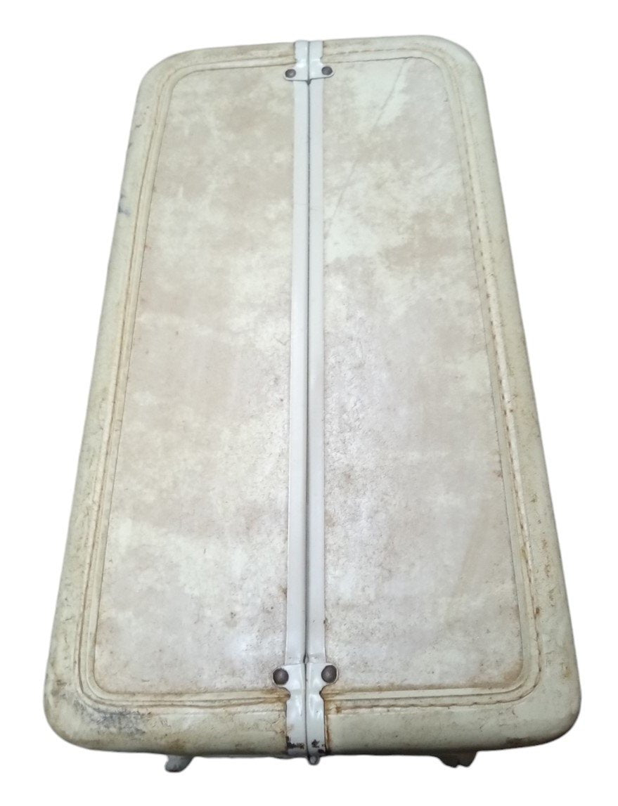 This is a vintage white Samsonite suitcase likely made around the 1950s. Some marks and scratches are visible in places. This is a great item for any aspiring collector and is a perfect fit in any luggage collection. This measures about 21" by 7" by 13". The inside is about 3" deep.
