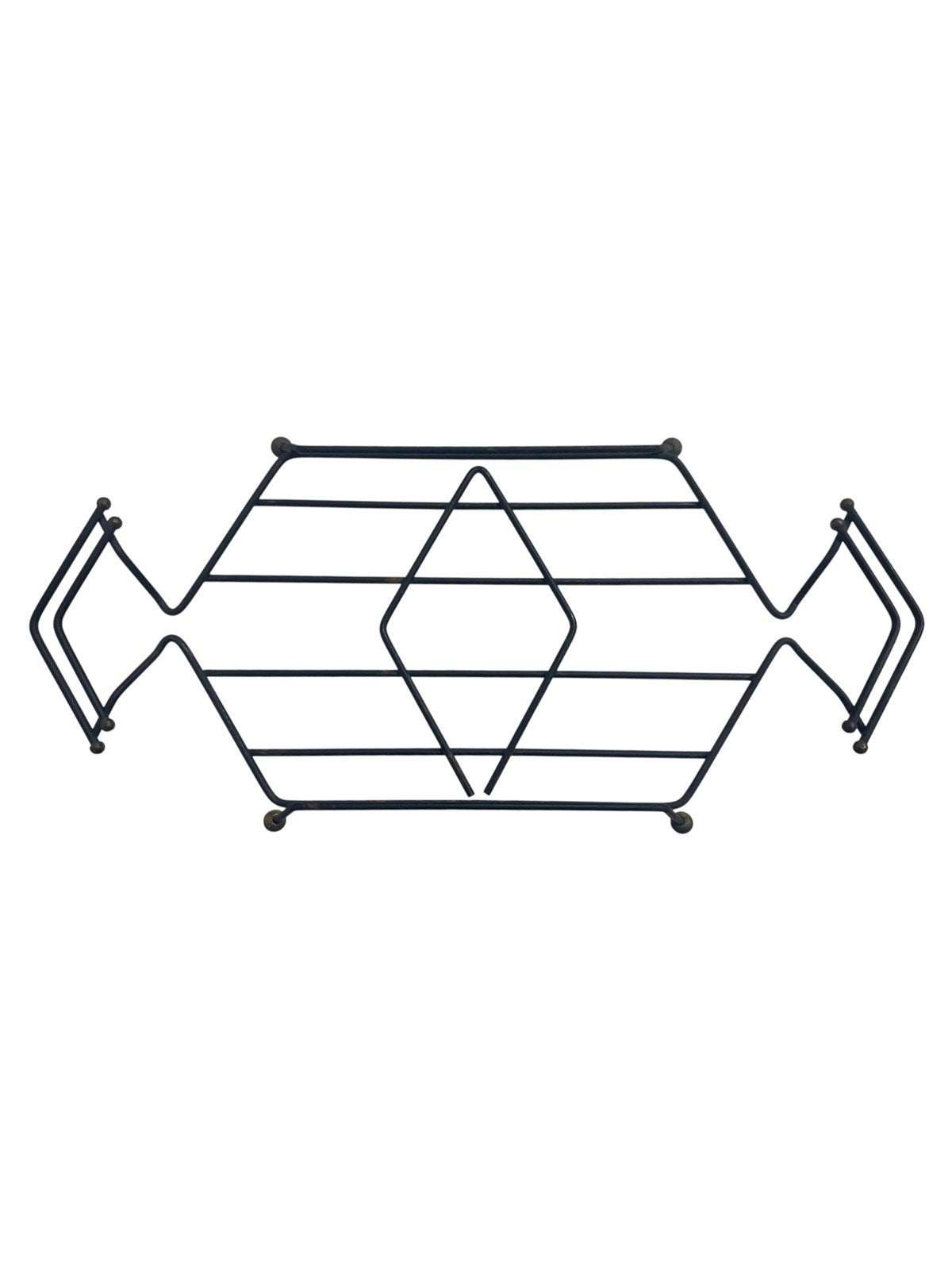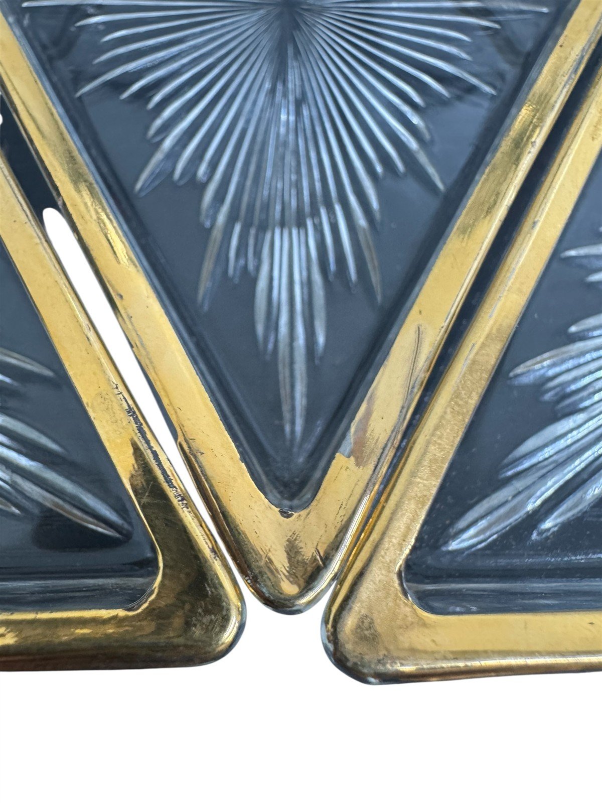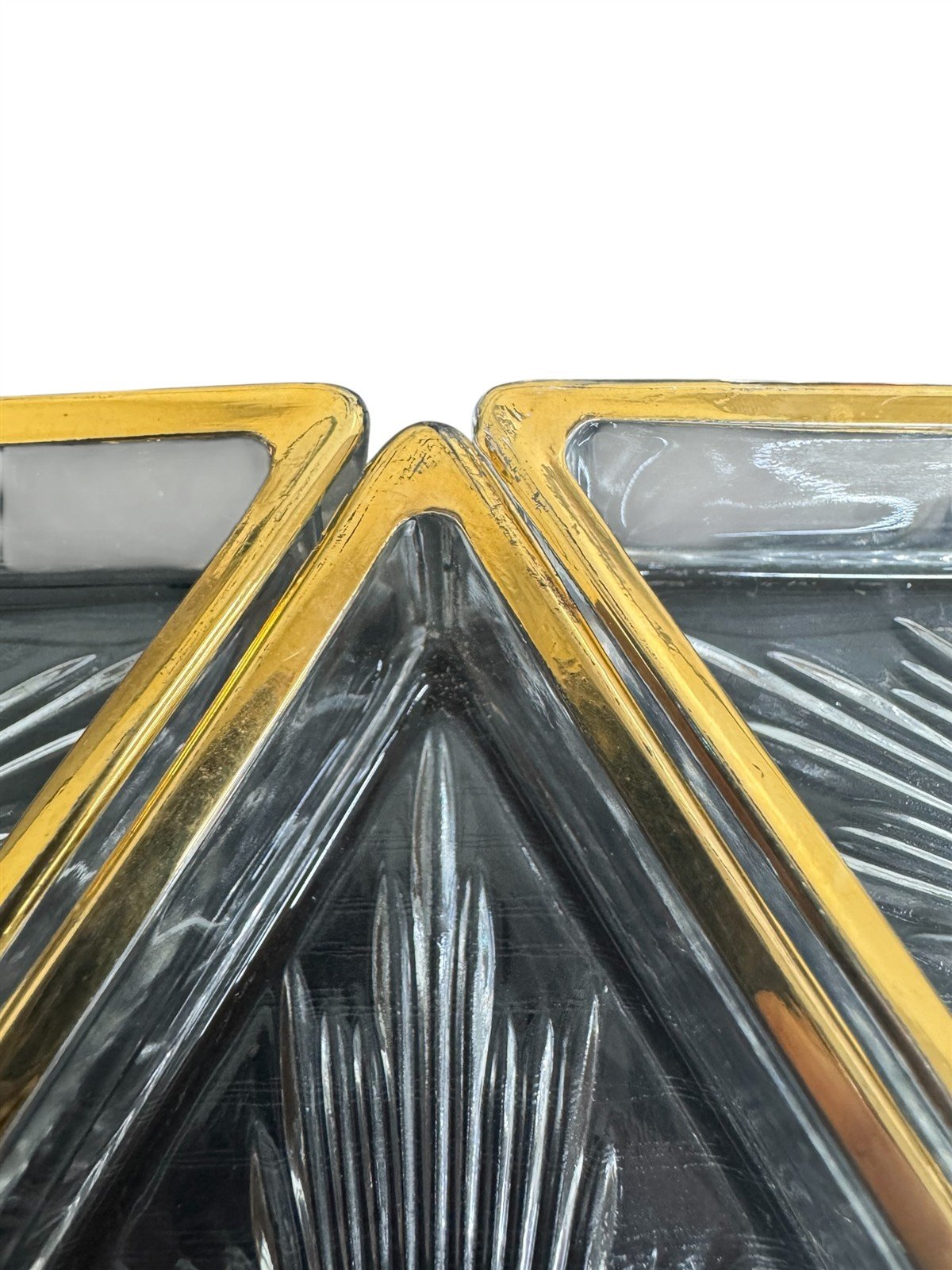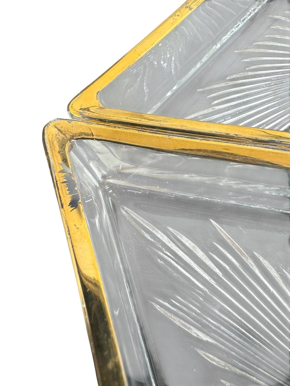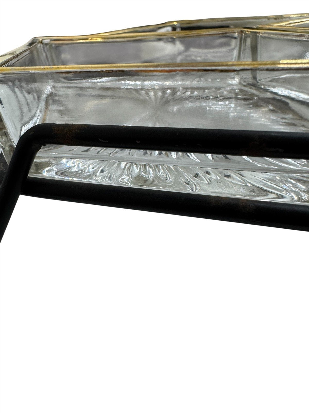 This is a beautiful server from Jeanette Glass Co. from the It's a Dilly collection. This set includes 5 glass dishes and 1 metal tray to hold the dishes. The piece is in good condition with some rust on the metal and some discoloration on the gold trim accents. Each glass dish is about 7.5" long and 4.5" wide. All together in the stand, the piece is 19" long and 9.5" wide. All dishes are removable. This is a perfect set for any collector!Take a look at the pictures for the best description. A photo is as good as a thousand words and is the best description of cosmetic condition. Use your ZOOM TOOL to best see this item! Please look closely at the photos for condition answers.