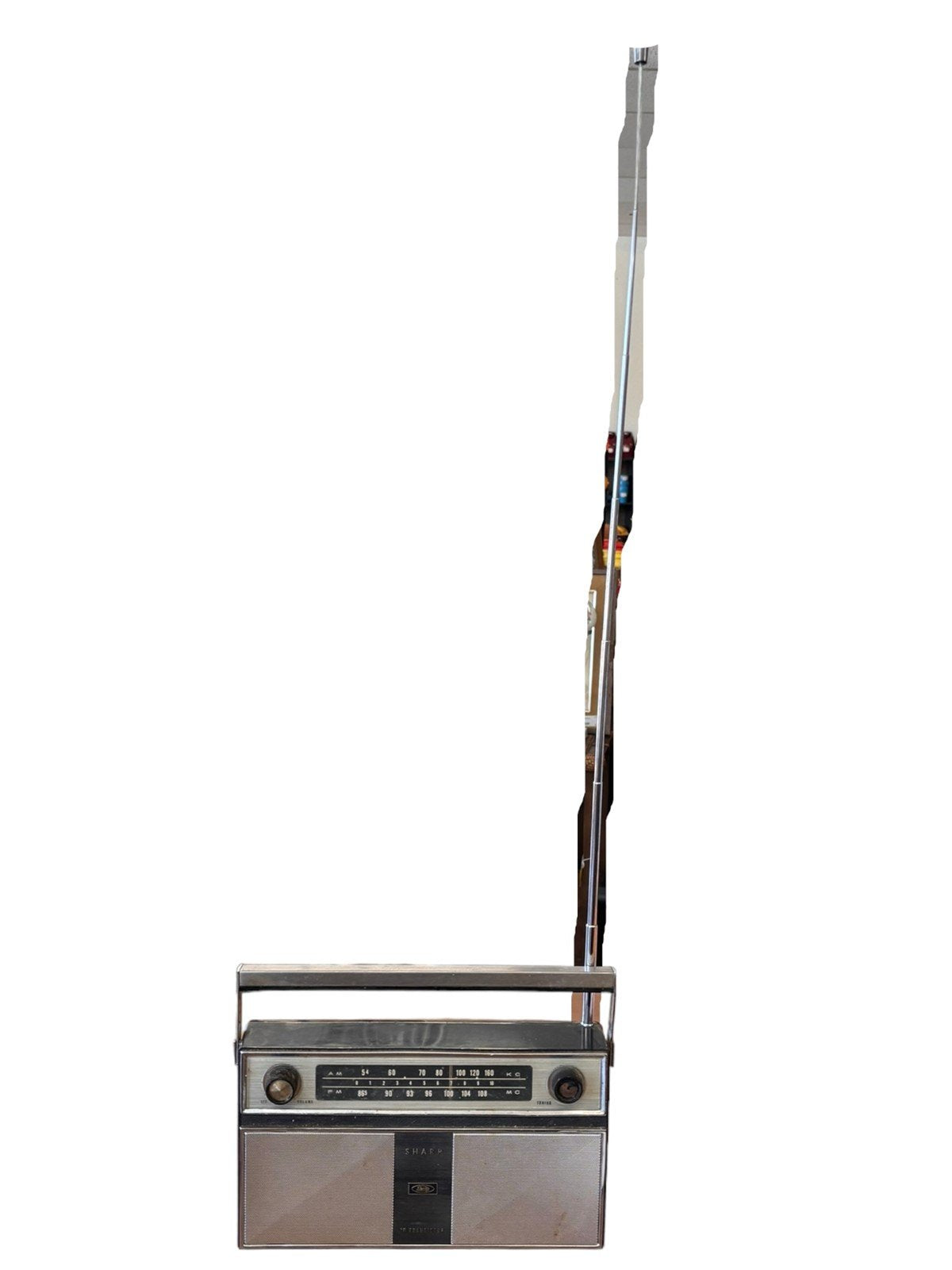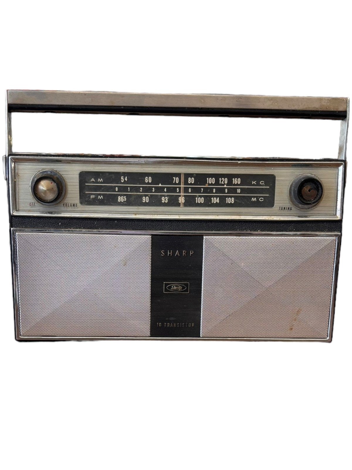 This radio was made by Sharp. It's in working condition. It has a leather case, it has some vintage wear. The antenna is 23 1/2in long. The actual radio is 10in x 2 1/4in x 7 1/2in.Take a look at the pictures for the best description. A photo is as good as a thousand words and is the best description of cosmetic condition. Use your ZOOM TOOL to best see this item! Please look closely at the photos for condition answers.