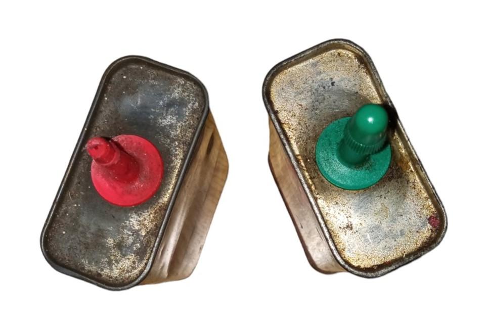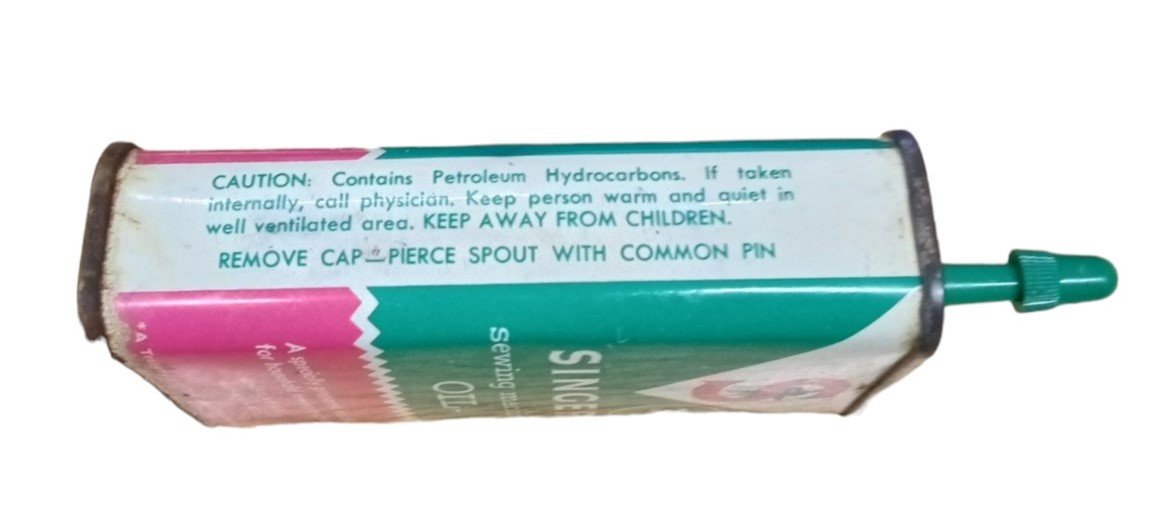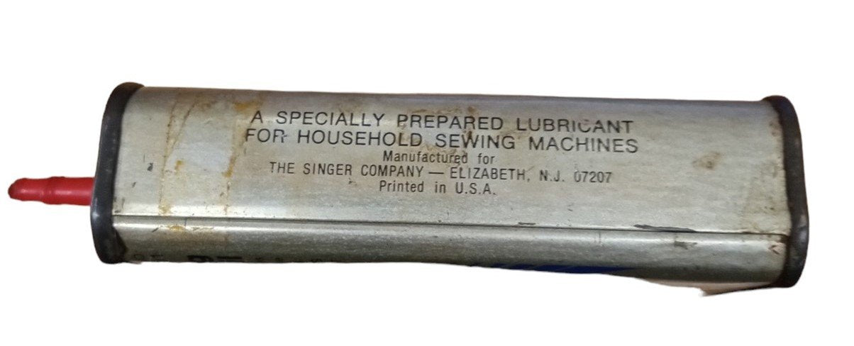 This is a pair of vintage Singer Sewing Machine Oil cans likely made around the 1960s. They both show visible rust and dents. One of the cans still contains some of the original contents while the other is empty. These are great for any aspiring collector and are a perfect fit in any sewing collection!