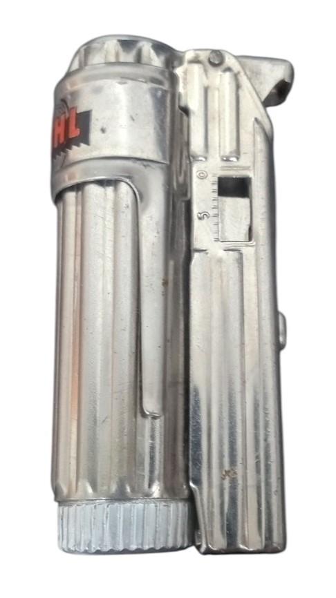 This is a vintage Stihl lighter likely made around the 1960s. Some minor marks and scratches are visible. This does not appear to work. This is a great item for any aspiring collector and will fit perfectly in any tobacciana or lighter collection! This measures about 2" by 1".