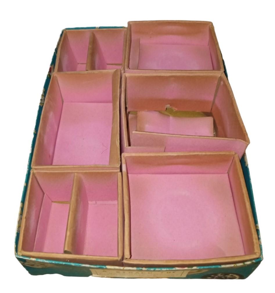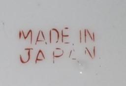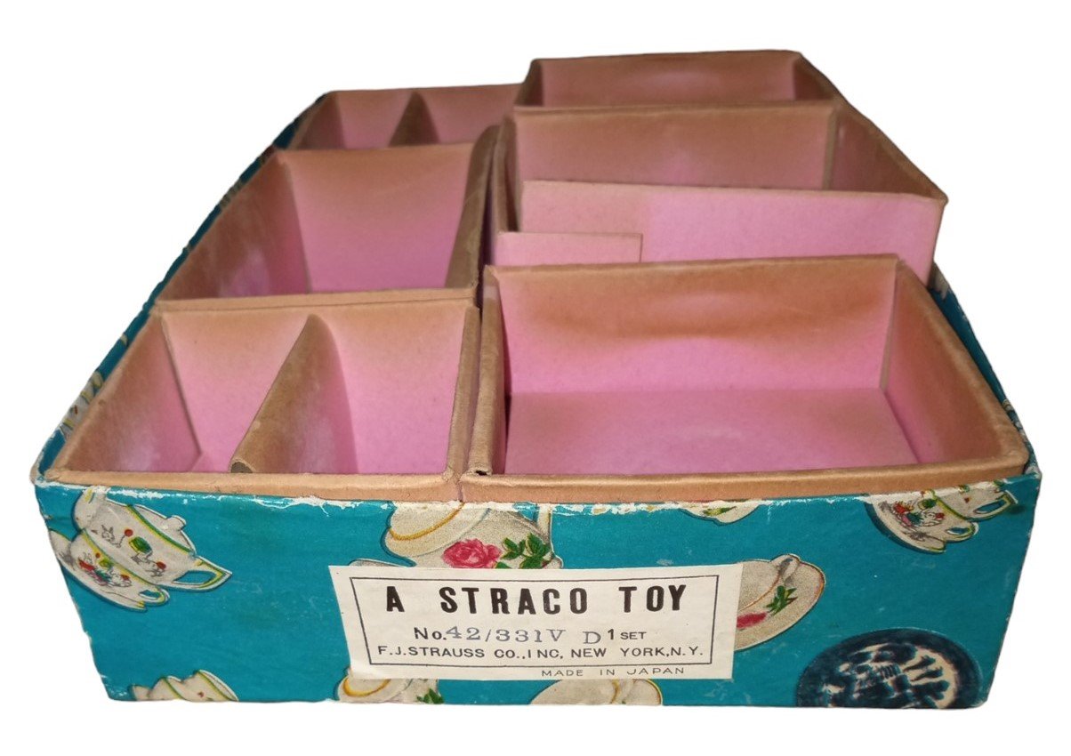 This is a vintage children's tea set made by Straco likely around the 1950s. One of the saucers has two chips in it, but the other pieces appear to be undamaged. The box has some minor marks and tears. This is a great set for any aspiring collector and is a perfect fit in any ceramic collection! This set includes 4 saucers (about 3" by 3" by 0.5") 4 teacups (about 3" by 2" by 1") 1 creamer (about 3" by 1" by 2") 1 sugar (about 3" by 1" by 2") 1 teapot (about 4" by 1" by 2") 3 lids (about 1" by 1" by 0.5")