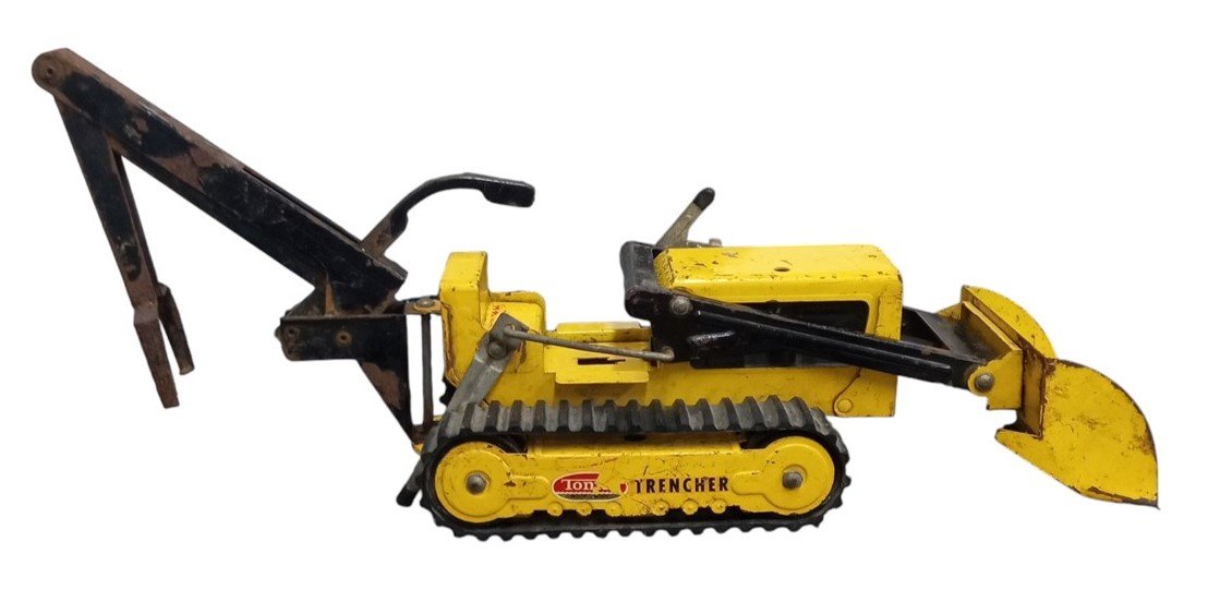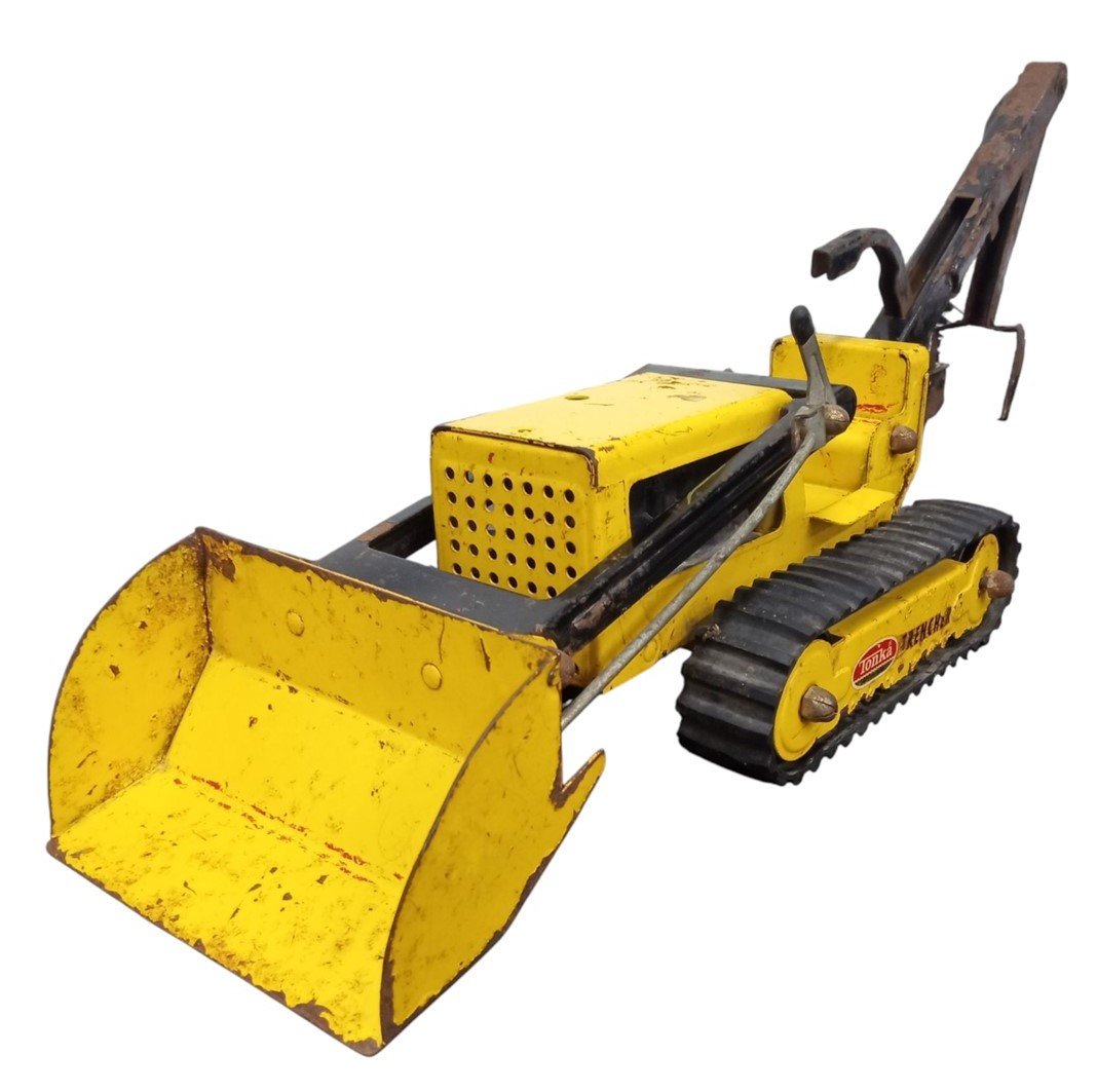 This is a vintage Tonka Trencher construction vehicle toy likely made around the 1960s. Marks and scratches are visible as well as spots of rust. The backhoe is missing the scoop. This is a charming piece with plenty of character, perfect whether you're an aspiring collector or an avid Tonka enthusiast! This measures about 19" by 5" by 8".