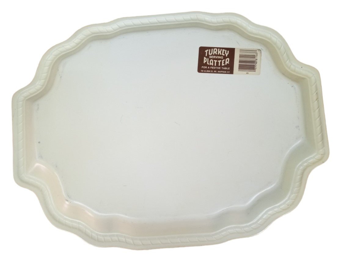 This is a vintage plastic turkey platter made by Ullman likely around the 1990s. It has some visible marks and scratches. This is a great item for any aspiring collector and is perfect for serving the Thanksgiving turkey with style! This measures about 18" by 14" by 1".
