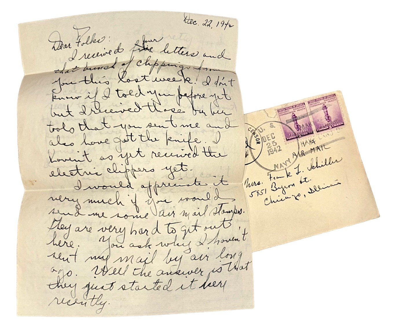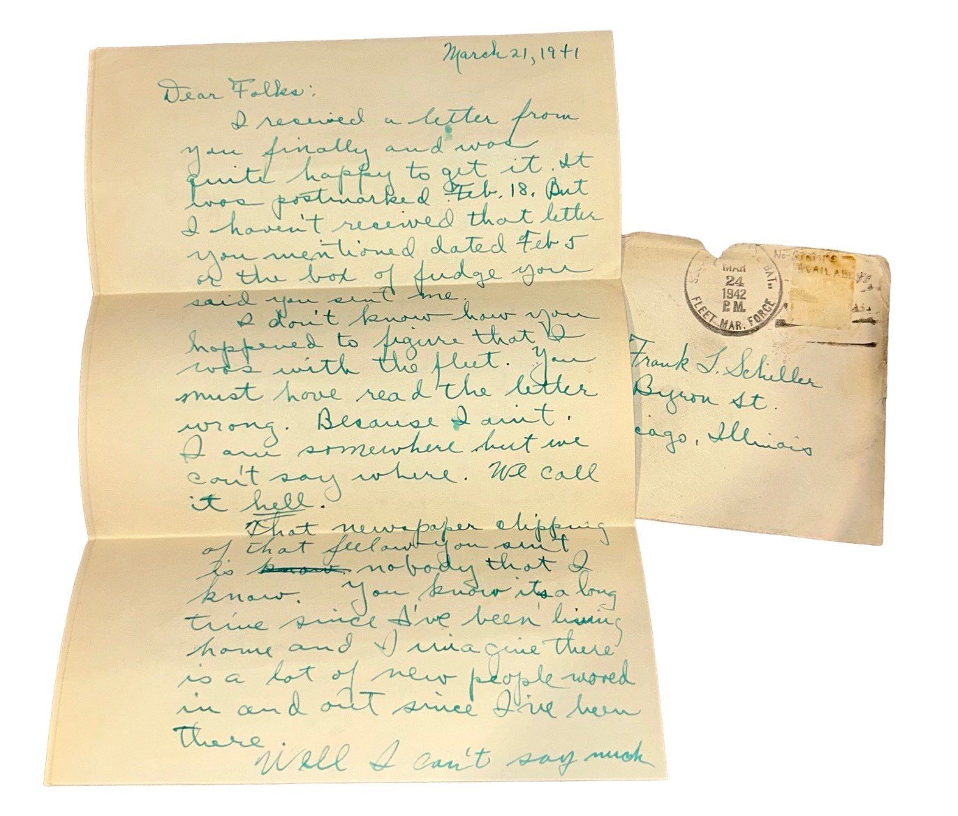 Here's a set of three letters from the World War ii Era from a navy soldier to his parents. His location is kept secret. In all his letters he writes, he asks about his family. He also requested airmail stamps so he could send more letters. The letters have a unique stamp from the fleet force along with a stamp stating there is no classified information in the letters. Also included is a world war i -from January 1, 1923- United States government thrift card. The card has three $0.25 stamps attached to it. These are all in very good condition.Take a look at the pictures for the best description. A photo is as good as a thousand words and is the best description of cosmetic condition. Use your ZOOM TOOL to best see this item! Please look closely at the photos for condition answers.