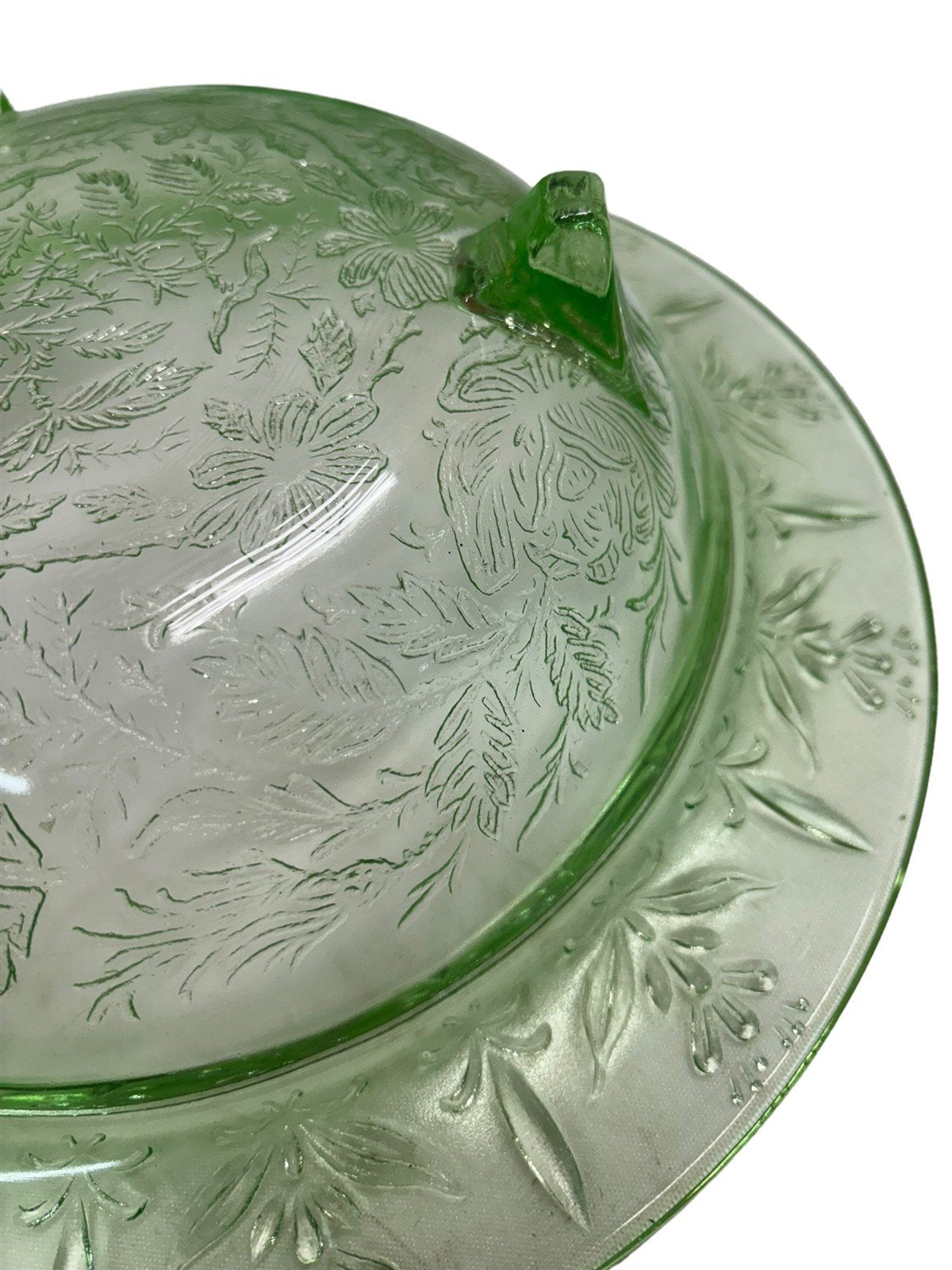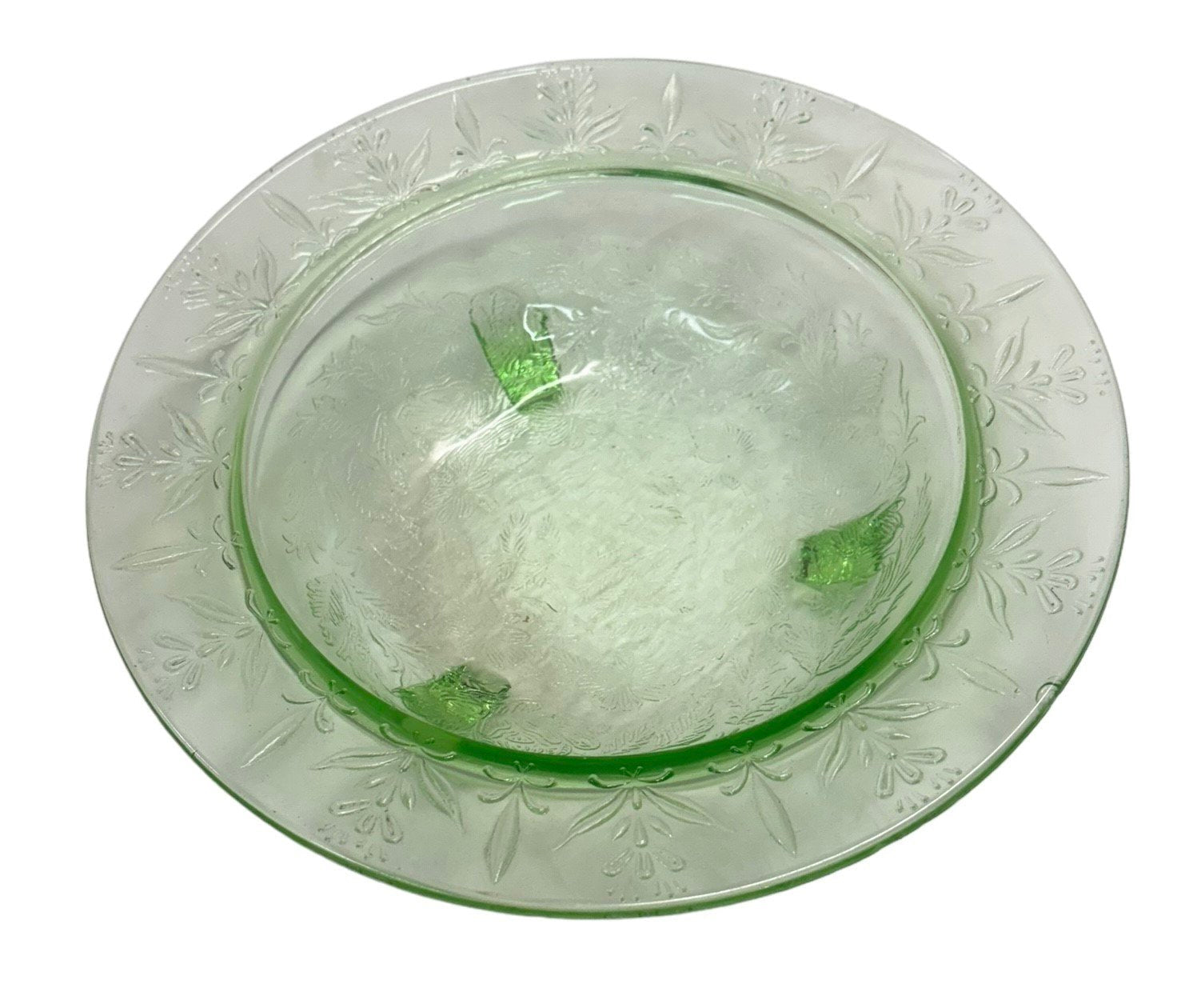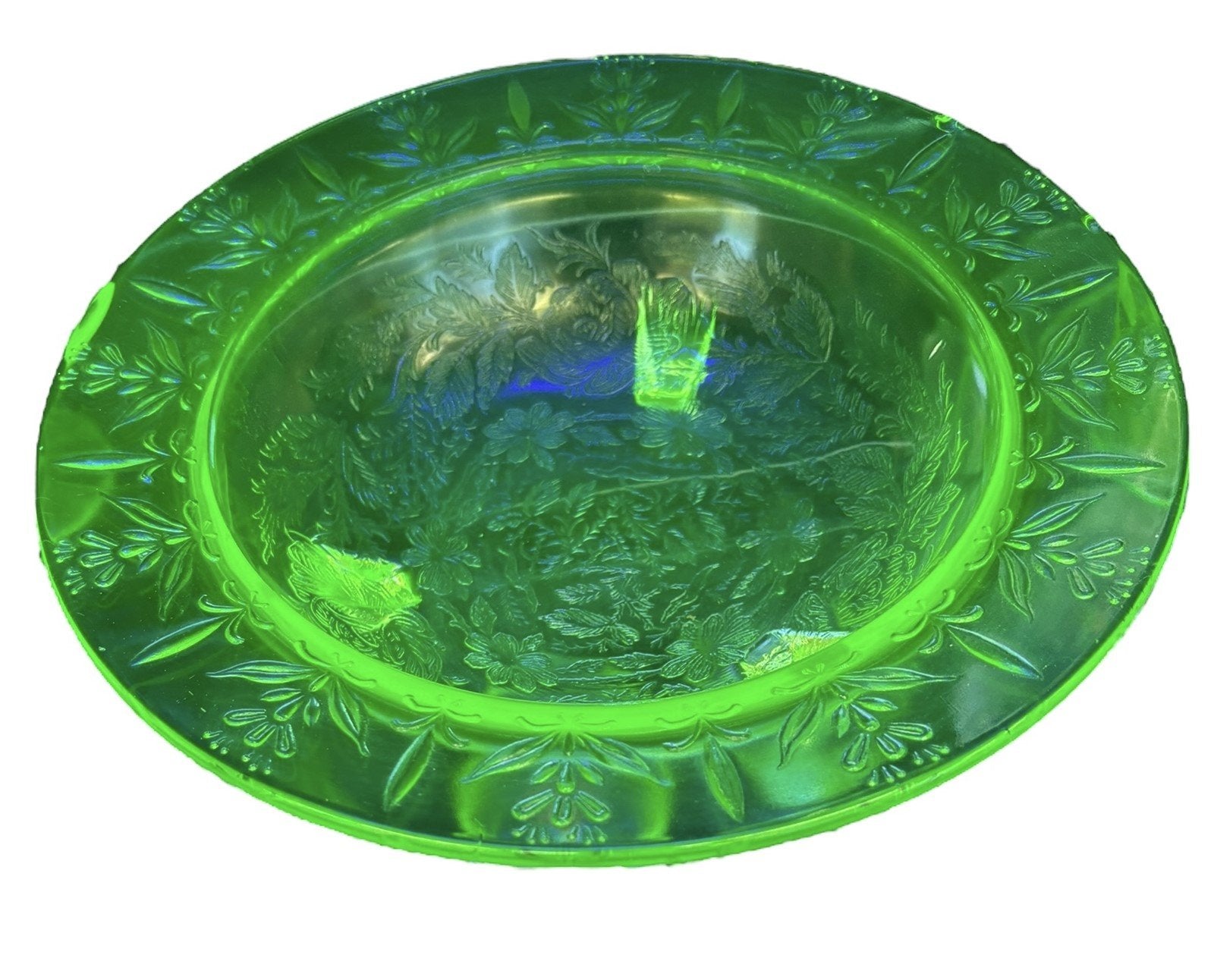Gorgeous Uranium Dish. This bowl has 3 legs ad stands 3 inches tall. It has an 11 inch diameter. The light green color is so pretty and matches perfectly with the floral embossing! The bowl is very reactive to UV light. In great condition and super high quality!Take a look at the pictures for the best description. A photo is as good as a thousand words and is the best description of cosmetic condition. Use your ZOOM TOOL to best see this item! Please look closely at the photos for condition answers.