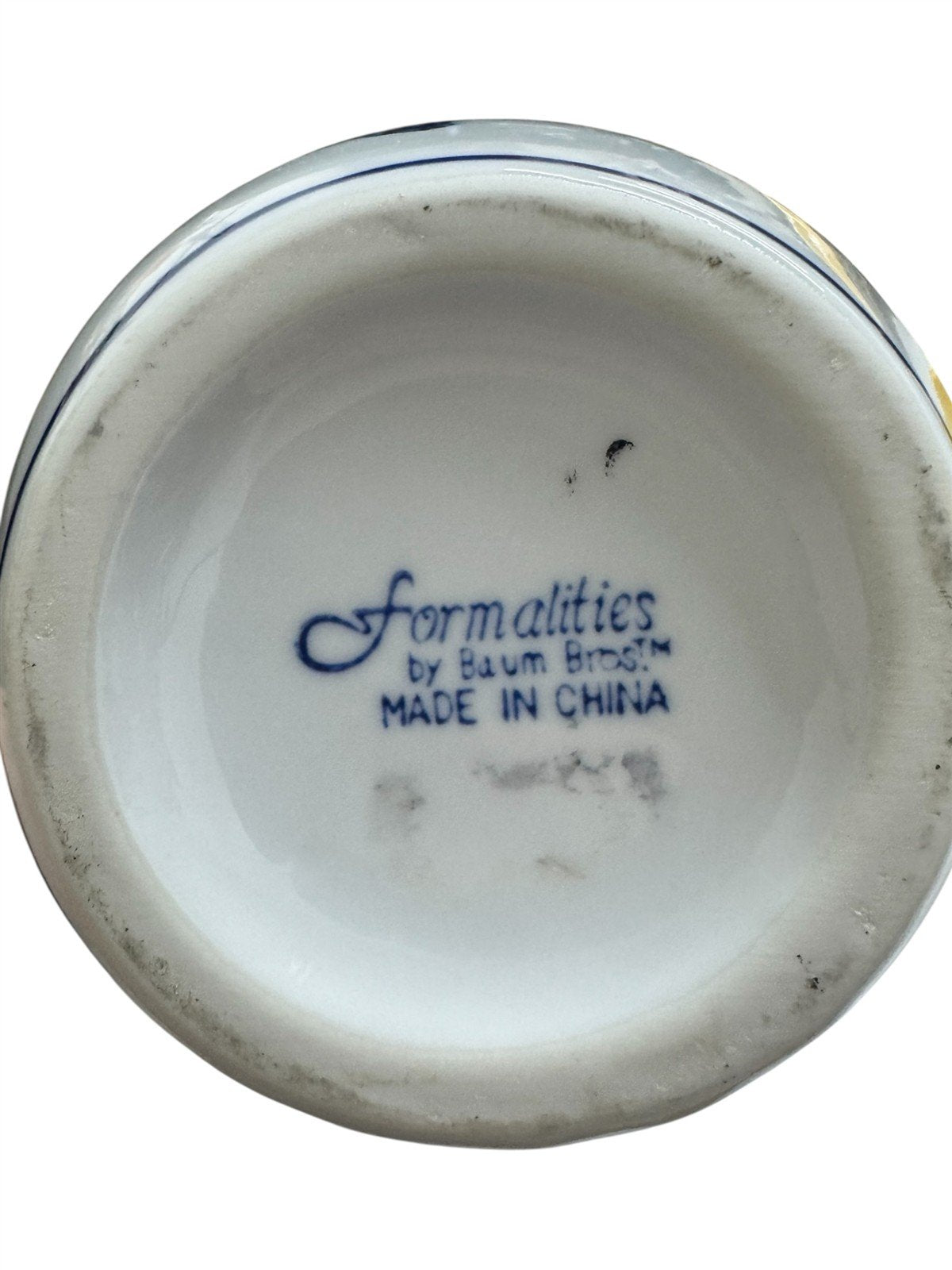 This is a beautiful vintage blue and white vase by Baum Bros. from Formalities. This vase measures at about 10" tall. This piece would be great to fill with flowers or leave empty as home decor. This piece is in great condition but there are a few cosmetic marks on the outside and inside. This is a perfect piece for any collector!Take a look at the pictures for the best description. A photo is as good as a thousand words and is the best description of cosmetic condition. Use your ZOOM TOOL to best see this item! Please look closely at the photos for condition answers.