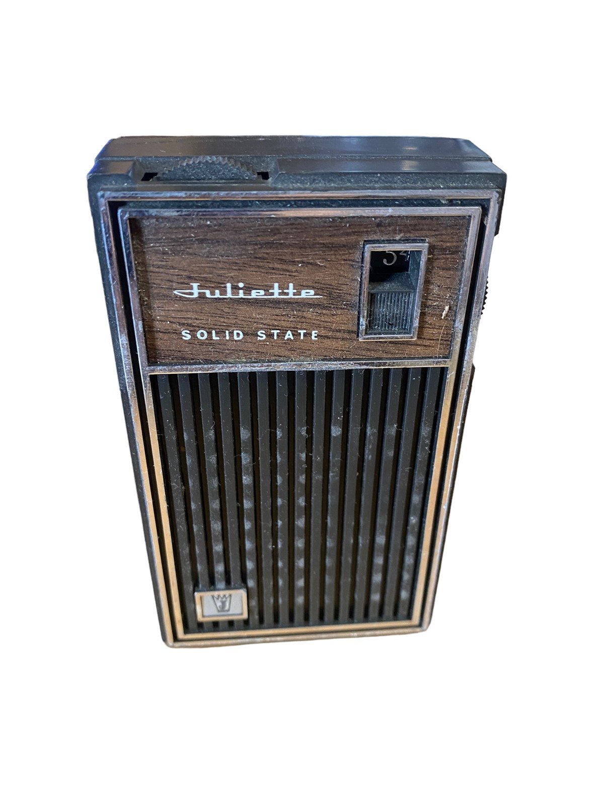 Vintage Juliette pocket radio, model APR-206B Solid State. 4.5" x 2.5"Take a look at the pictures for the best description. A photo is as good as a thousand words and is the best description of cosmetic condition. Use your ZOOM TOOL to best see this item! Please look closely at the photos for condition answers.