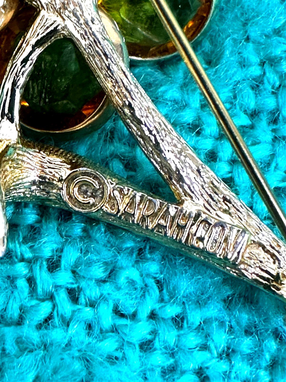 Mint condition Sarah Coventry signed gold-toned flower brooch, featuring amber colored gemstone petals with a faux pearl center. Measuring at about 2.5in" this brooch is a perfect elegant touch to any outfit.