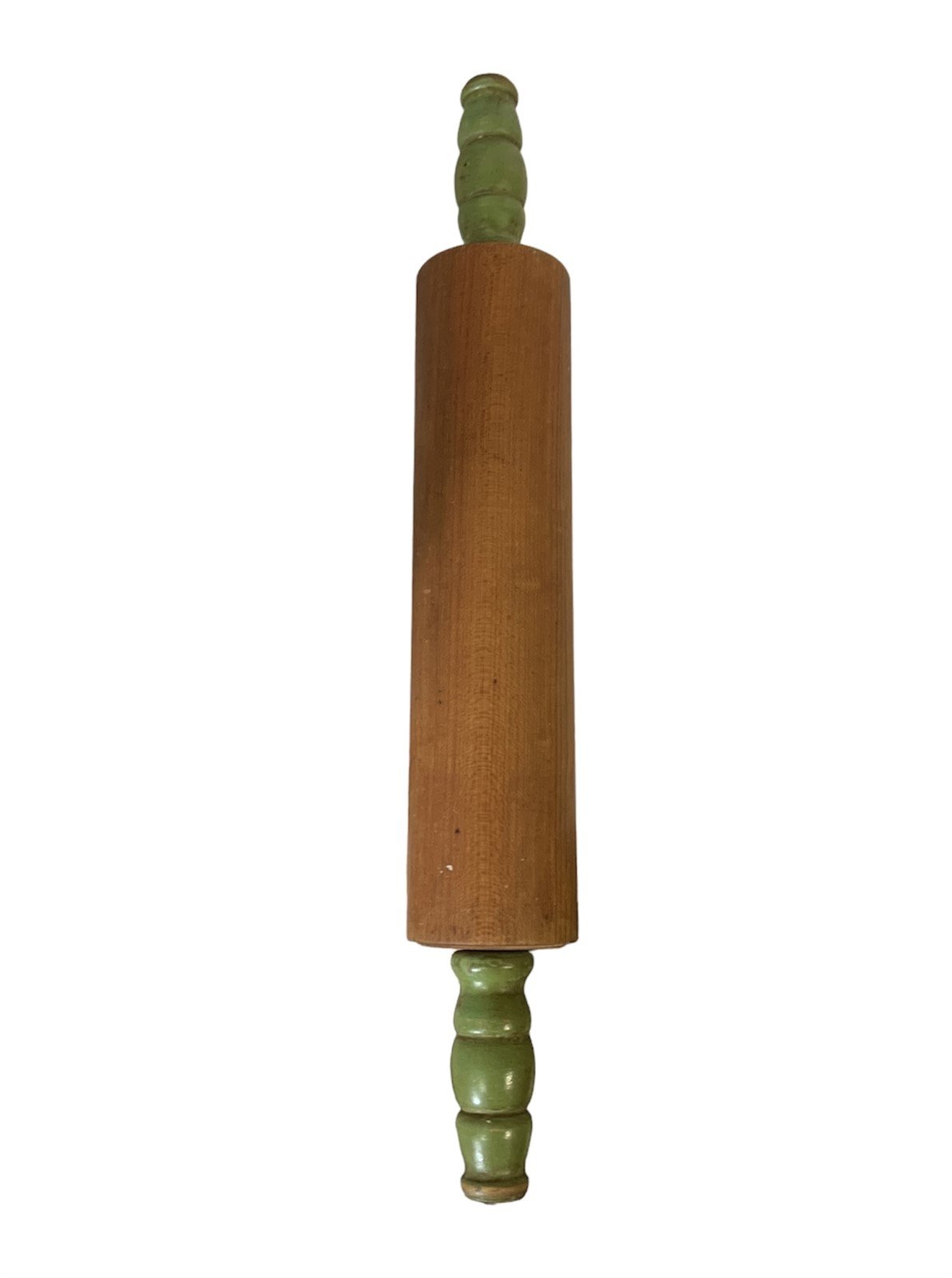 Awesome Vintage Rolling Pin. Made of wood and has green handles. Slight vintage wear and tear. Rolling part is 10.5 inches, whole pin is 17 inches.Take a look at the pictures for the best description. A photo is as good as a thousand words and is the best description of cosmetic condition. Use your ZOOM TOOL to best see this item! Please look closely at the photos for condition answers.