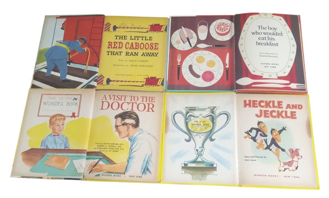 This is a set of 4 vintage Wonder Books published between 1952 and 1963. General wear from age is visible, including marks, scratches & minor tears, but all of the pages still appear to be intact. The spines and bindings show the most wear but are still holding together. This set is great for any apsiring collector and is perfect for filling out your home library! Each book measures about 8" by 6.5" by 0.5" This set includes The Little Red Caboose That Ran Away (1952) Heckle & Jeckle (1957) A Visit To The Doctor (1960) The Boy Who Wouldn't Eat His Breakfast (1963)