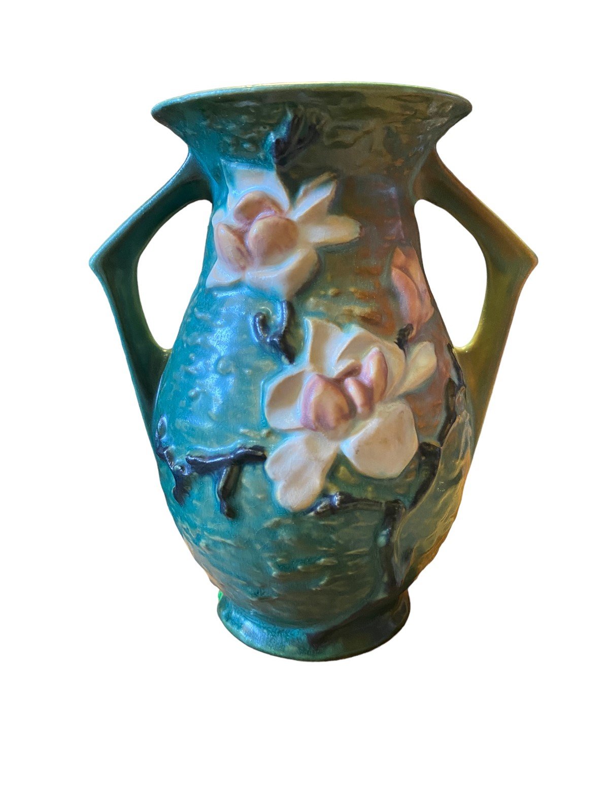 Roseville Pottery 90-7 Blue Magnolia Double Handle Vase Vintage