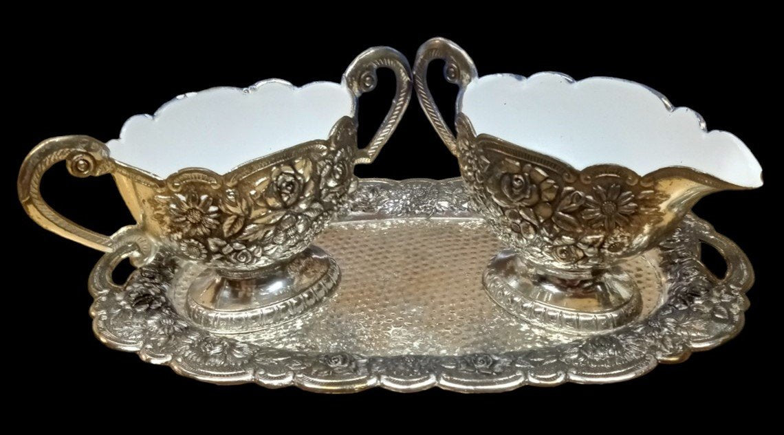Silverplate Ornate Enamel Creamer, Sugar Bowl & Tray Set Vintage Japanese
